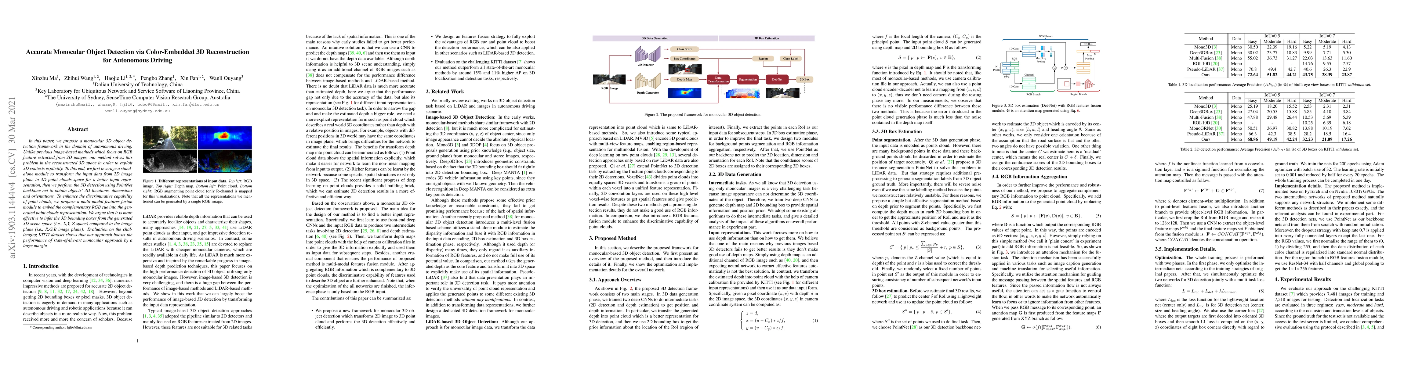 This paper introduces a monocular 3D object detection framework for autonomous driving that reconstructs 3D point clouds from 2D images to exploit 3D contexts, enhancing detection accuracy by embedding RGB cues into the point clouds. The proposed method outperforms existing monocular approaches on the KITTI dataset.