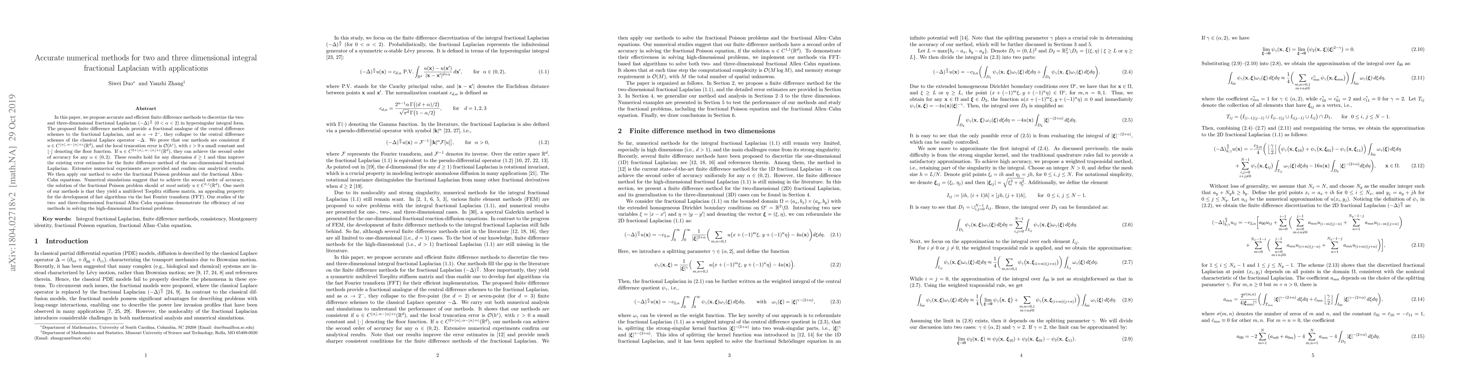 In this paper, we propose accurate and efficient finite difference methods to discretize the two- and three-dimensional fractional Laplacian $(-\Delta)^{\frac{\alpha}{2}}$ ($0 < \alpha < 2$) in hypersingular integral form. The proposed finite difference methods provide a fractional analogue of the central difference schemes to the fractional Laplacian, and as $\alpha \to 2^-$, they collapse to the central difference schemes of the classical Laplace operator $-\Delta$. We prove that our methods are consistent if $u \in C^{\lfloor\alpha\rfloor, \alpha-\lfloor\alpha\rfloor+\epsilon}({\mathbb R}^d)$, and the local truncation error is ${\mathcal O}(h^\epsilon)$, with $\epsilon > 0$ a small constant and $\lfloor \cdot \rfloor$ denoting the floor function. If $u \in C^{2+\lfloor\alpha\rfloor, \alpha-\lfloor\alpha\rfloor+\epsilon}({\mathbb R}^d)$, they can achieve the second order of accuracy for any $\alpha \in (0, 2)$. These results hold for any dimension $d \ge 1$ and thus improve the existing error estimates for the finite difference method of the one-dimensional fractional Laplacian. Extensive numerical experiments are provided and confirm our analytical results. We then apply our method to solve the fractional Poisson problems and the fractional Allen-Cahn equations. Numerical simulations suggest that to achieve the second order of accuracy, the solution of the fractional Poisson problem should {\it at most} satisfy $u \in C^{1,1}({\mathbb R}^d)$. One merit of our methods is that they yield a multilevel Toeplitz stiffness matrix, an appealing property for the development of fast algorithms via the fast Fourier transform (FFT). Our studies of the two- and three-dimensional fractional Allen-Cahn equations demonstrate the efficiency of our methods in solving the high-dimensional fractional problems.