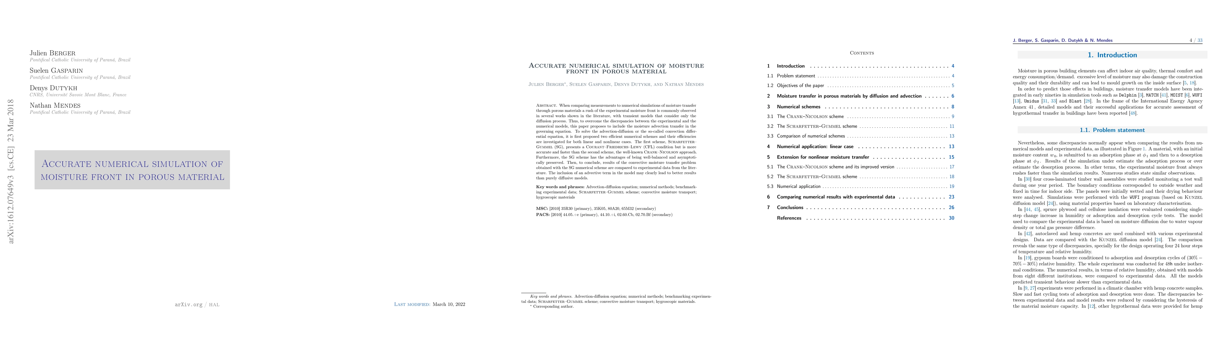 This study improves numerical simulations of moisture fronts in porous materials by incorporating advection, achieving more accurate results than purely diffusive models.