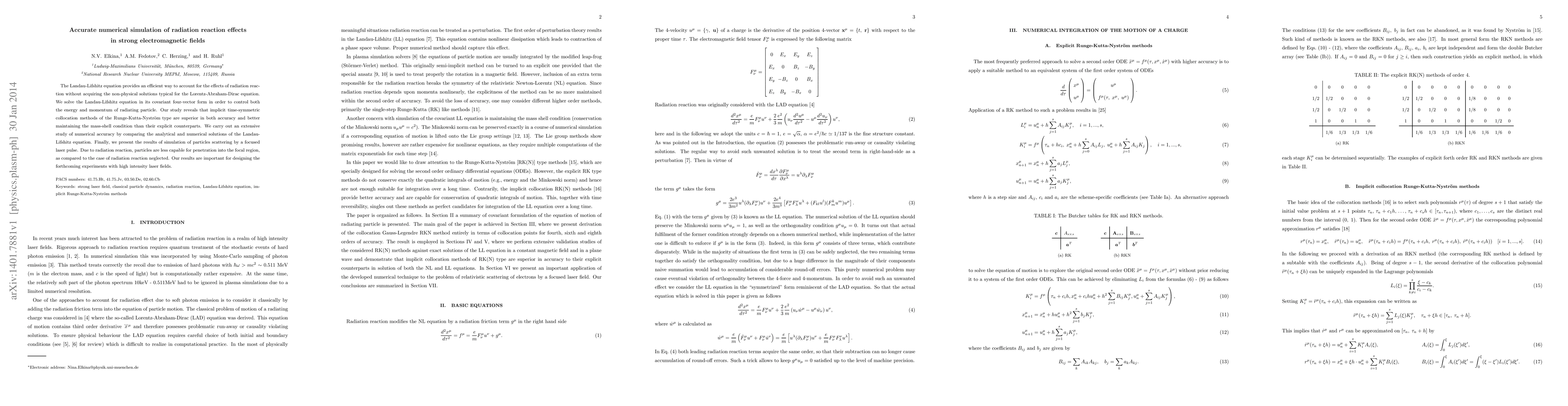 This paper investigates the Landau-Lifshitz equation for radiation reaction effects in strong electromagnetic fields, finding that implicit Runge-Kutta-Nyström methods are more accurate than explicit methods. The study also shows that particles are less likely to penetrate laser focal regions due to radiation reaction, which is crucial for high-intensity laser experiments.