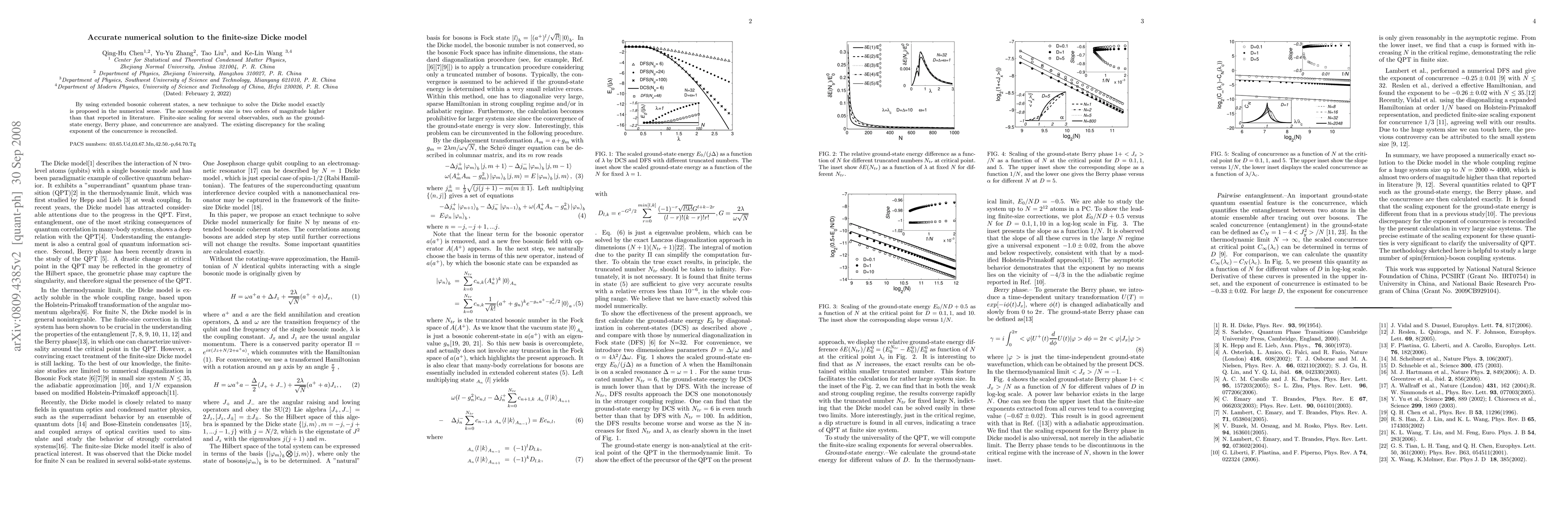This paper introduces a novel numerical method using extended bosonic coherent states to solve the finite-size Dicke model accurately, enabling analysis of system sizes two orders of magnitude larger than previously reported. The study reconciles discrepancies in the scaling exponent of concurrence and analyzes finite-size scaling for key observables.