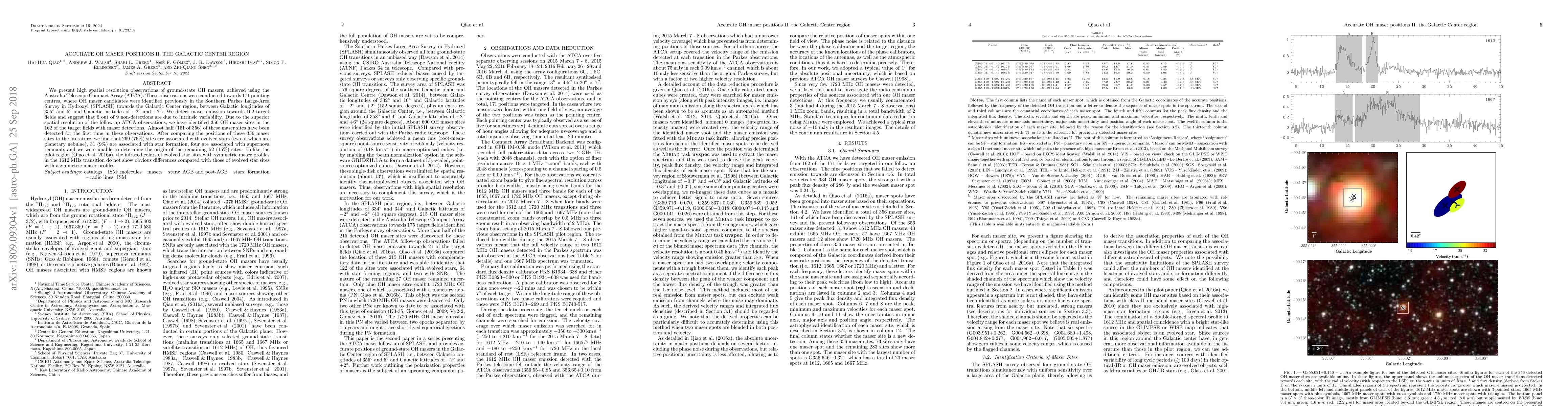 The study utilizes high-resolution ATCA observations to pinpoint 356 OH maser sites in the Galactic Center, with 161 discovered anew. Most are linked to evolved stars, while others relate to star formation or supernova remnants. Notably, infrared color differences among evolved star maser sites aren't apparent based on profile symmetry.