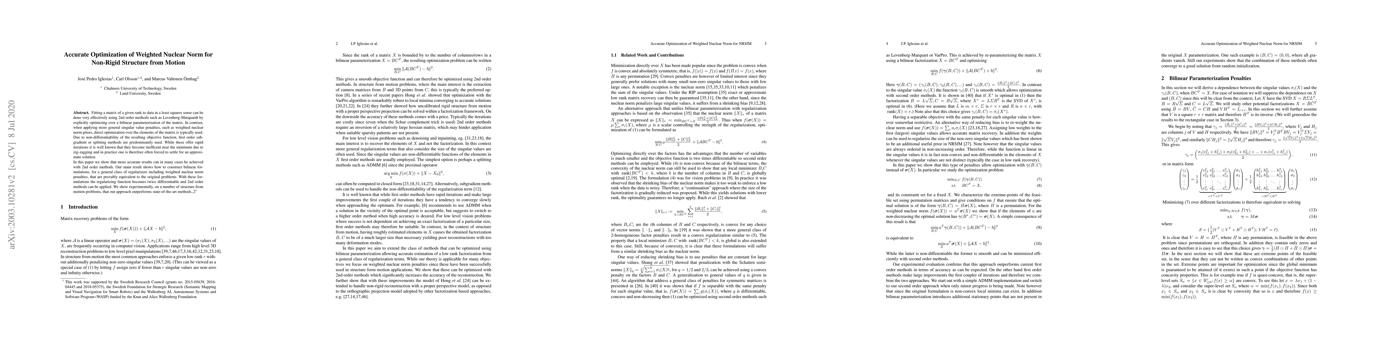 Fitting a matrix of a given rank to data in a least squares sense can be done very effectively using 2nd order methods such as Levenberg-Marquardt by explicitly optimizing over a bilinear parameterization of the matrix. In contrast, when applying more general singular value penalties, such as weighted nuclear norm priors, direct optimization over the elements of the matrix is typically used. Due to non-differentiability of the resulting objective function, first order sub-gradient or splitting methods are predominantly used. While these offer rapid iterations it is well known that they become inefficent near the minimum due to zig-zagging and in practice one is therefore often forced to settle for an approximate solution. In this paper we show that more accurate results can in many cases be achieved with 2nd order methods. Our main result shows how to construct bilinear formulations, for a general class of regularizers including weighted nuclear norm penalties, that are provably equivalent to the original problems. With these formulations the regularizing function becomes twice differentiable and 2nd order methods can be applied. We show experimentally, on a number of structure from motion problems, that our approach outperforms state-of-the-art methods.