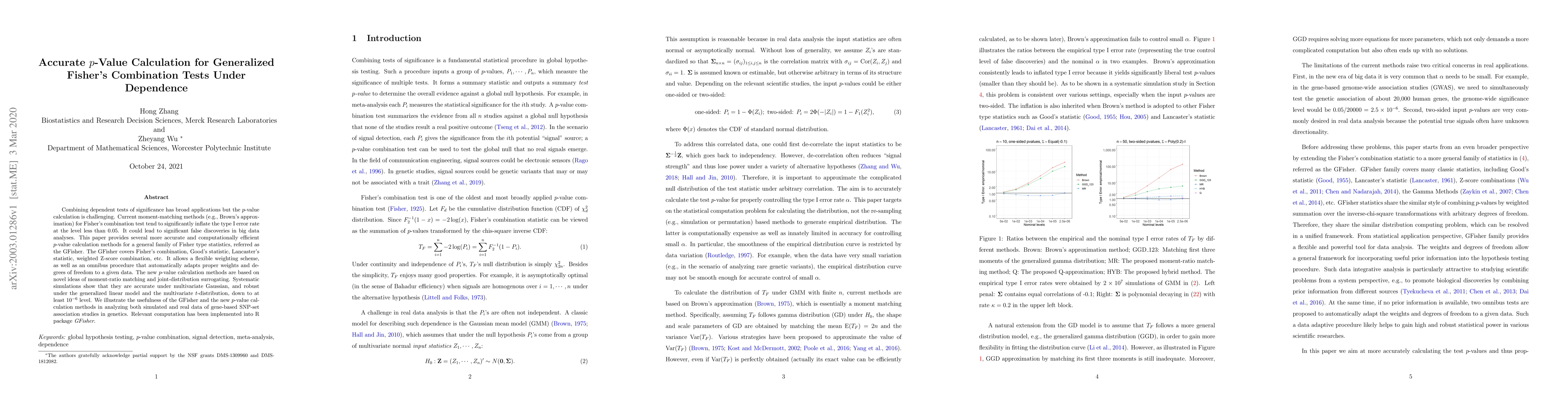 Combining dependent tests of significance has broad applications but the $p$-value calculation is challenging. Current moment-matching methods (e.g., Brown's approximation) for Fisher's combination test tend to significantly inflate the type I error rate at the level less than 0.05. It could lead to significant false discoveries in big data analyses. This paper provides several more accurate and computationally efficient $p$-value calculation methods for a general family of Fisher type statistics, referred as the GFisher. The GFisher covers Fisher's combination, Good's statistic, Lancaster's statistic, weighted Z-score combination, etc. It allows a flexible weighting scheme, as well as an omnibus procedure that automatically adapts proper weights and degrees of freedom to a given data. The new $p$-value calculation methods are based on novel ideas of moment-ratio matching and joint-distribution surrogating. Systematic simulations show that they are accurate under multivariate Gaussian, and robust under the generalized linear model and the multivariate $t$-distribution, down to at least $10^{-6}$ level. We illustrate the usefulness of the GFisher and the new $p$-value calculation methods in analyzing both simulated and real data of gene-based SNP-set association studies in genetics. Relevant computation has been implemented into R package $GFisher$.