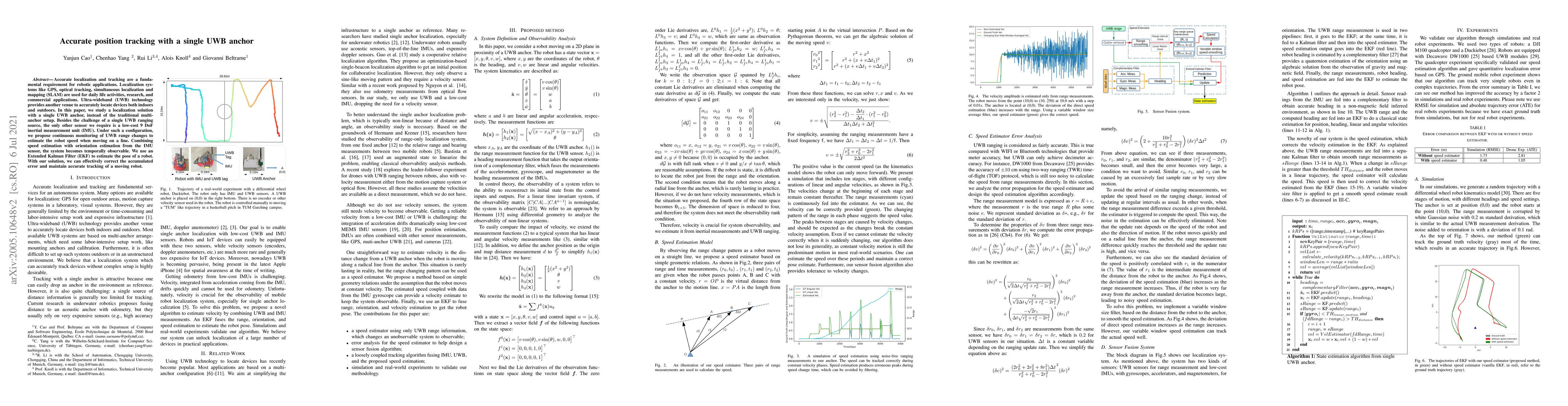 This paper proposes an accurate localization solution using a single ultra-wideband (UWB) anchor and a low-cost 9 DoF inertial measurement unit (IMU) to estimate robot speed and orientation. An Extended Kalman Filter is employed to maintain precise tracking by correcting accumulated errors.