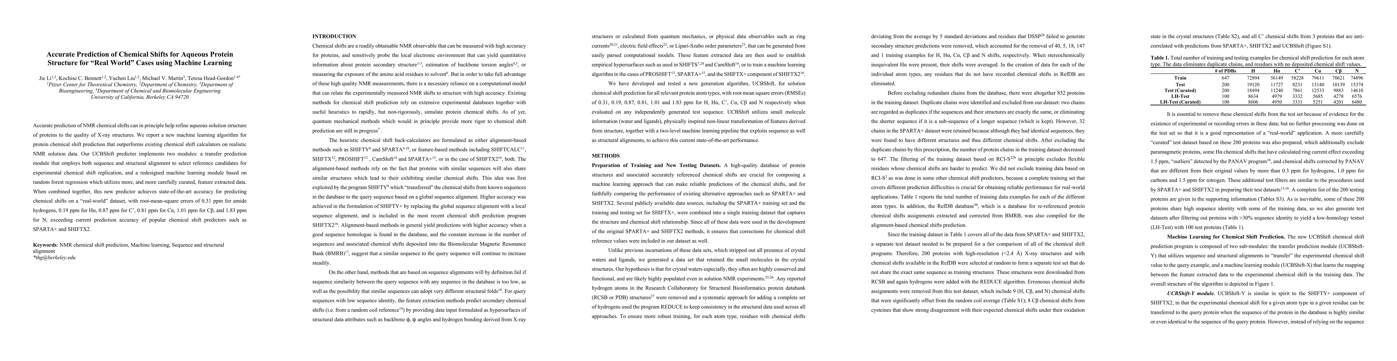 Accurate prediction of NMR chemical shifts can in principle help refine aqueous solution structure of proteins to the quality of X-ray structures. We report a new machine learning algorithm for protein chemical shift prediction that outperforms existing chemical shift calculators on realistic NMR solution data. Our UCBShift predictor implements two modules: a transfer prediction module that employs both sequence and structural alignment to select reference candidates for experimental chemical shift replication, and a redesigned machine learning module based on random forest regression which utilizes more, and more carefully curated, feature extracted data. When combined together, this new predictor achieves state of the art accuracy for predicting chemical shifts on a "real-world" dataset, with root-mean-square errors of 0.31 ppm for amide hydrogens, 0.19 ppm for Halpha, 0.87 ppm for C, 0.81 ppm for Calpha, 1.01 ppm for Cbeta, and 1.83 ppm for N, exceeding current prediction accuracy of popular chemical shift predictors such as SPARTA+ and SHIFTX2.