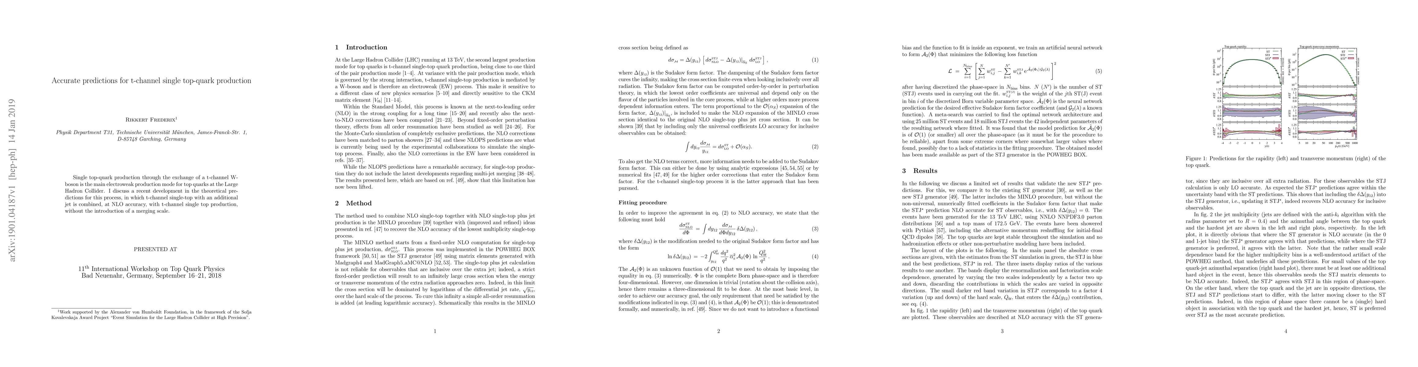 This paper presents refined theoretical predictions for t-channel single top-quark production at the Large Hadron Collider, combining t-channel single top with an additional jet at next-to-leading order accuracy without a merging scale. The results enhance the accuracy of electroweak top-quark production predictions.