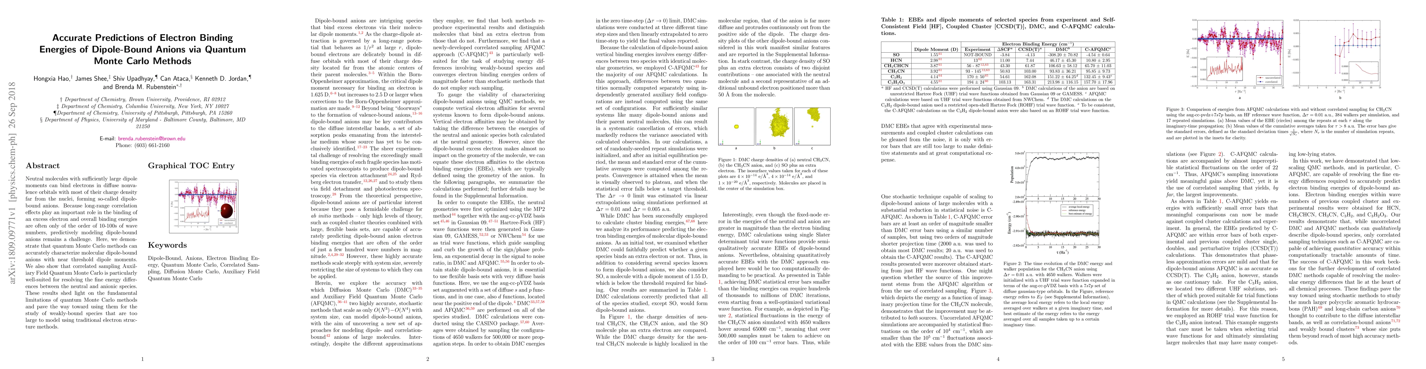 This paper demonstrates that quantum Monte Carlo methods, particularly the correlated sampling Auxiliary Field Quantum Monte Carlo, can accurately predict the electron binding energies of dipole-bound anions, which are neutral molecules that bind electrons in diffuse orbitals. These findings highlight the potential of quantum Monte Carlo for studying weakly-bound species that are too large for traditional methods.