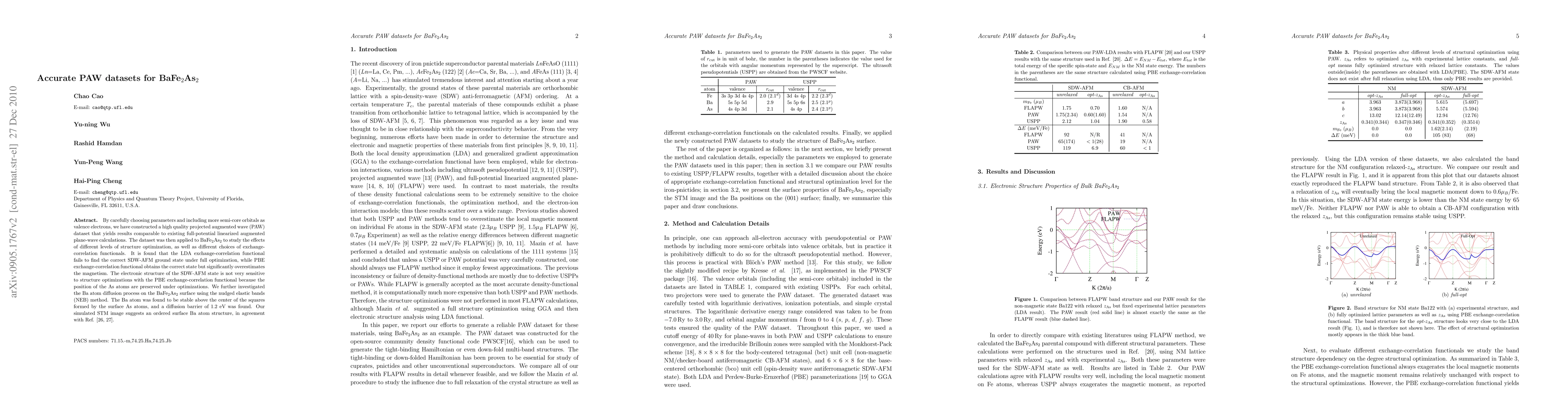 By carefully choosing parameters and including more semi-core orbitals as valence electrons, we have constructed a high quality projected augmented wave (PAW) dataset that yields results comparable to existing full-potential linearized augmented plane-wave calculations. The dataset was then applied to BaFe$_2$As$_2$ to study the effects of different levels of structure optimization, as well as different choices of exchange-correlation functionals. It is found that the LDA exchange-correlation functional fails to find the correct SDW-AFM ground state under full optimization, while PBE exchange-correlation functional obtains the correct state but significantly overestimates the magnetism. The electronic structure of the SDW-AFM state is not very sensitive to structure optimizations with the PBE exchange-correlation functional because the position of the As atoms are preserved under optimizations. We further investigated the Ba atom diffusion process on the BaFe$_2$As$_2$ surface using the nudged elastic bands (NEB) method. The Ba atom was found to be stable above the center of the squares formed by the surface As atoms, and a diffusion barrier of 1.2 eV was found. Our simulated STM image suggests an ordered surface Ba atom structure, in agreement with Ref.