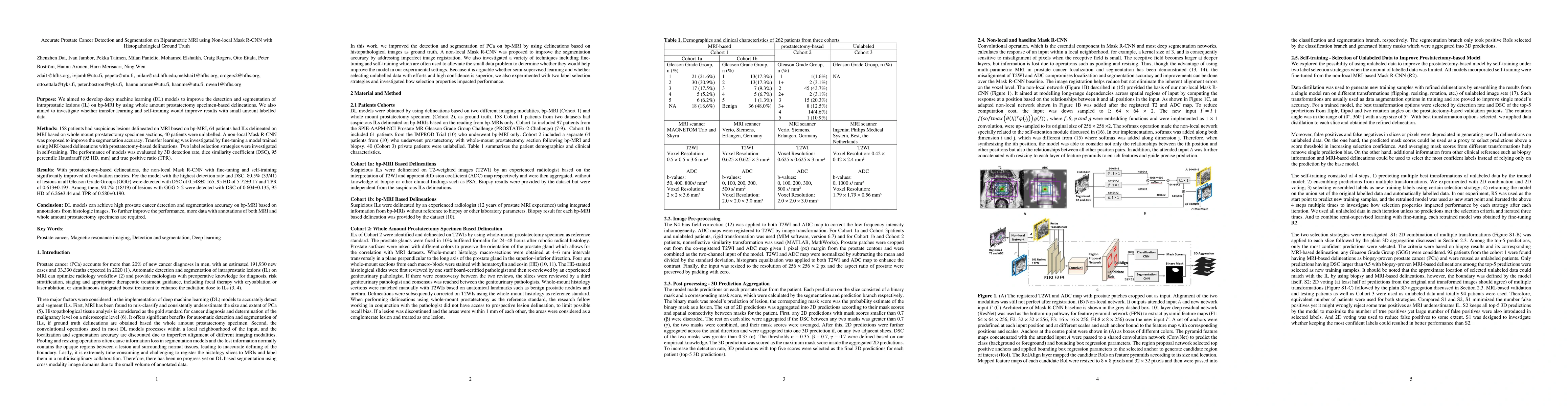 Purpose: We aimed to develop deep machine learning (DL) models to improve the detection and segmentation of intraprostatic lesions (IL) on bp-MRI by using whole amount prostatectomy specimen-based delineations. We also aimed to investigate whether transfer learning and self-training would improve results with small amount labelled data. Methods: 158 patients had suspicious lesions delineated on MRI based on bp-MRI, 64 patients had ILs delineated on MRI based on whole mount prostatectomy specimen sections, 40 patients were unlabelled. A non-local Mask R-CNN was proposed to improve the segmentation accuracy. Transfer learning was investigated by fine-tuning a model trained using MRI-based delineations with prostatectomy-based delineations. Two label selection strategies were investigated in self-training. The performance of models was evaluated by 3D detection rate, dice similarity coefficient (DSC), 95 percentile Hausdrauff (95 HD, mm) and true positive ratio (TPR). Results: With prostatectomy-based delineations, the non-local Mask R-CNN with fine-tuning and self-training significantly improved all evaluation metrics. For the model with the highest detection rate and DSC, 80.5% (33/41) of lesions in all Gleason Grade Groups (GGG) were detected with DSC of 0.548[0.165], 95 HD of 5.72[3.17] and TPR of 0.613[0.193]. Among them, 94.7% (18/19) of lesions with GGG > 2 were detected with DSC of 0.604[0.135], 95 HD of 6.26[3.44] and TPR of 0.580[0.190]. Conclusion: DL models can achieve high prostate cancer detection and segmentation accuracy on bp-MRI based on annotations from histologic images. To further improve the performance, more data with annotations of both MRI and whole amount prostatectomy specimens are required.