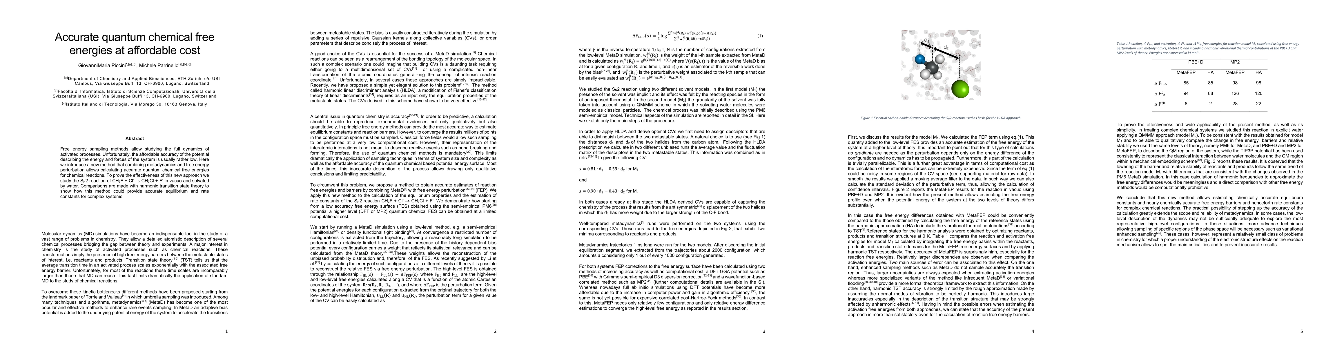 Free energy sampling methods allow studying the full dynamics of activated processes. Unfortunately, the affordable accuracy of the potential describing the energy and forces of the system is usually rather low. Here we introduce a new method that combining metadynamics and free energy perturbation allows calculating accurate quantum chemical free energies for chemical reactions. To prove the effectiveness of this new approach we study the S N 2 reaction of CH3F + Cl- -> CH3Cl + F- in vacuo and solvated by water. Comparisons are made with harmonic transition state theory to show how this method could provide accurate equilibrium and rate constants for complex systems.