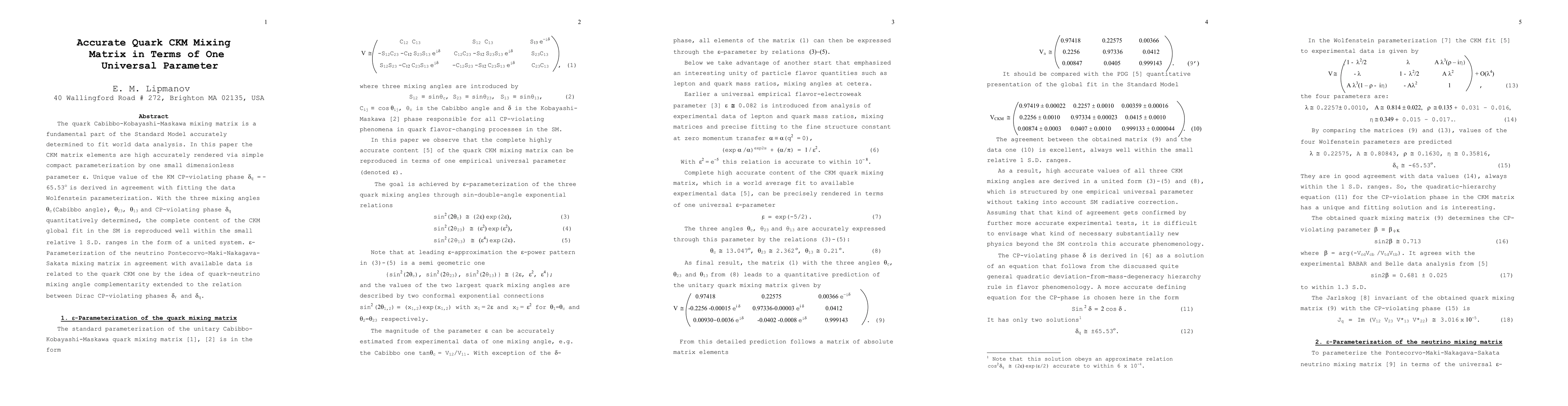 This paper presents an accurate parameterization of the quark Cabibbo-Kobayashi-Maskawa mixing matrix using a single universal parameter, achieving precise agreement with world data. It also derives a unique value for the KM CP-violating phase and extends the parameterization to the Pontecorvo-Maki-Nakagava-Sakata neutrino mixing matrix.