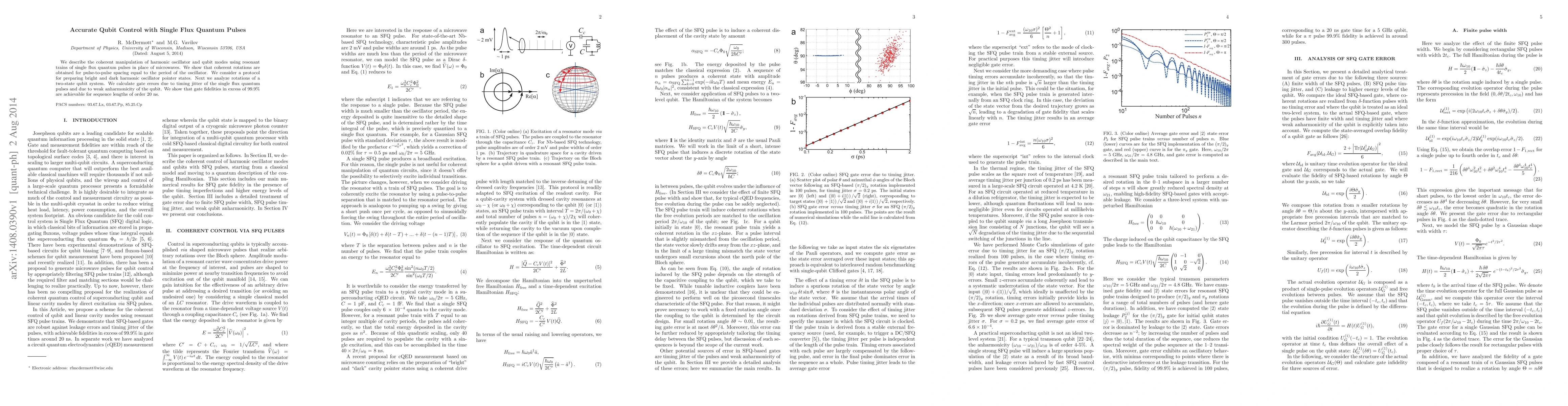 The paper presents a method for high-fidelity coherent manipulation of superconducting qubits and linear cavity modes using resonant trains of SFQ pulses, which can be generated locally in the qubit cryostat without the need for an external microwave generator.