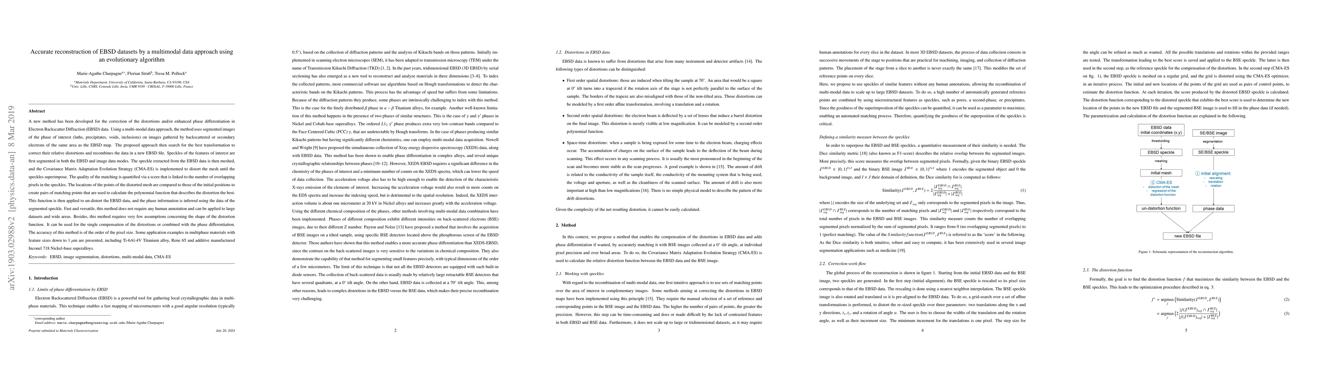 This paper introduces a new method for correcting distortions in Electron Backscatter Diffraction (EBSD) data using a multimodal data approach and an evolutionary algorithm. The method segments and meshes speckles from EBSD and complementary images, applying a Covariance Matrix Adaptation Evolution Strategy (CMA-ES) to find the best transformation for distortion correction, achieving high accuracy and requiring minimal human intervention.