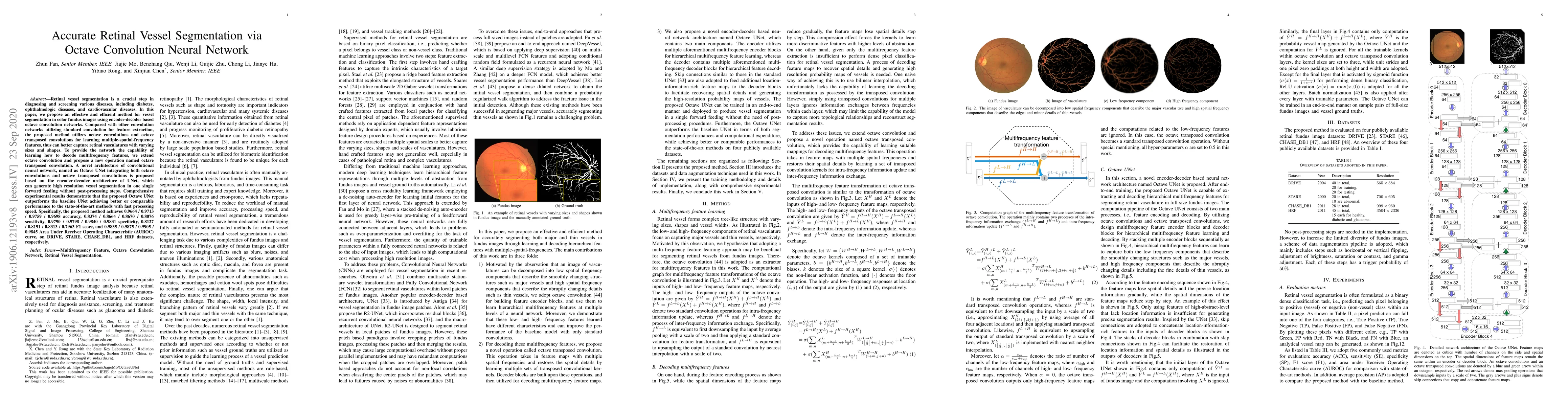 This paper proposes an Octave UNet for retinal vessel segmentation in color fundus images, utilizing octave convolutions and transposed convolutions to capture multi-frequency features. The method outperforms baseline UNet and state-of-the-art techniques, achieving high accuracy, sensitivity, specificity, F1 score, and Area Under the ROC curve on multiple datasets.