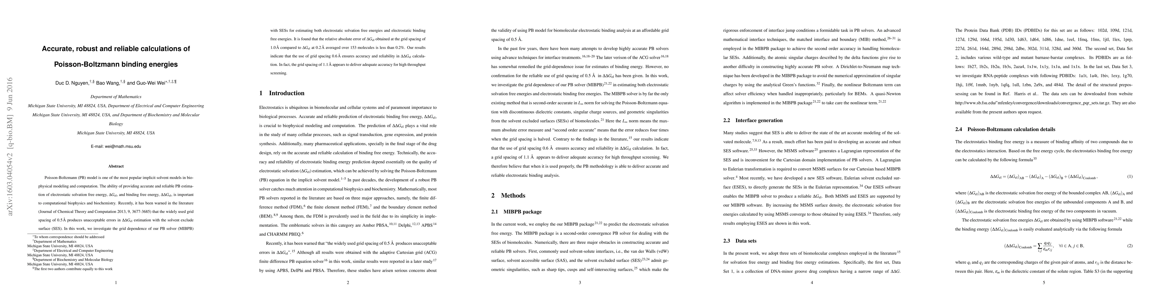 This paper investigates the accuracy of Poisson-Boltzmann (PB) model calculations for electrostatic solvation and binding free energies, finding that a grid spacing of $1.0$ \AA yields less than 0.2% error compared to $0.2$ \AA. The study concludes that $0.6$ \AA is optimal for reliable binding free energy calculations, while $1.1$ \AA suffices for high throughput screenings.