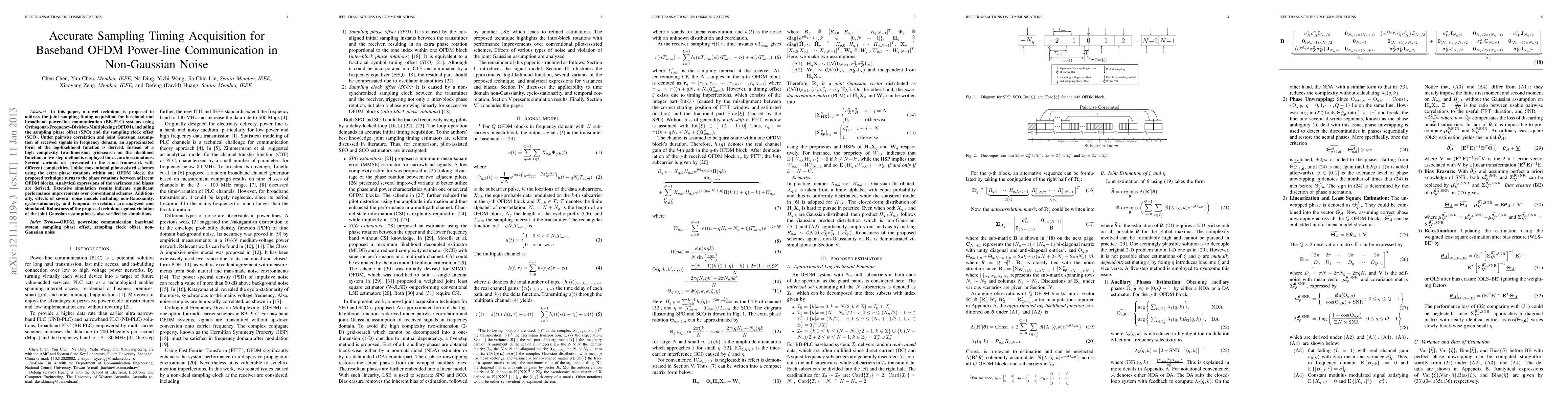 In this paper, a novel technique is proposed to address the joint sampling timing acquisition for baseband and broadband power-line communication (BB-PLC) systems using Orthogonal-Frequency-Division-Multiplexing (OFDM), including the sampling phase offset (SPO) and the sampling clock offset (SCO). Under pairwise correlation and joint Gaussian assumption of received signals in frequency domain, an approximated form of the log-likelihood function is derived. Instead of a high complexity two-dimension grid-search on the likelihood function, a five-step method is employed for accurate estimations. Several variants are presented in the same framework with different complexities. Unlike conventional pilot-assisted schemes using the extra phase rotations within one OFDM block, the proposed technique turns to the phase rotations between adjacent OFDM blocks. Analytical expressions of the variances and biases are derived. Extensive simulation results indicate significant performance improvements over conventional schemes. Additionally, effects of several noise models including non-Gaussianity, cyclo-stationarity, and temporal correlation are analyzed and simulated. Robustness of the proposed technique against violation of the joint Gaussian assumption is also verified by simulations.