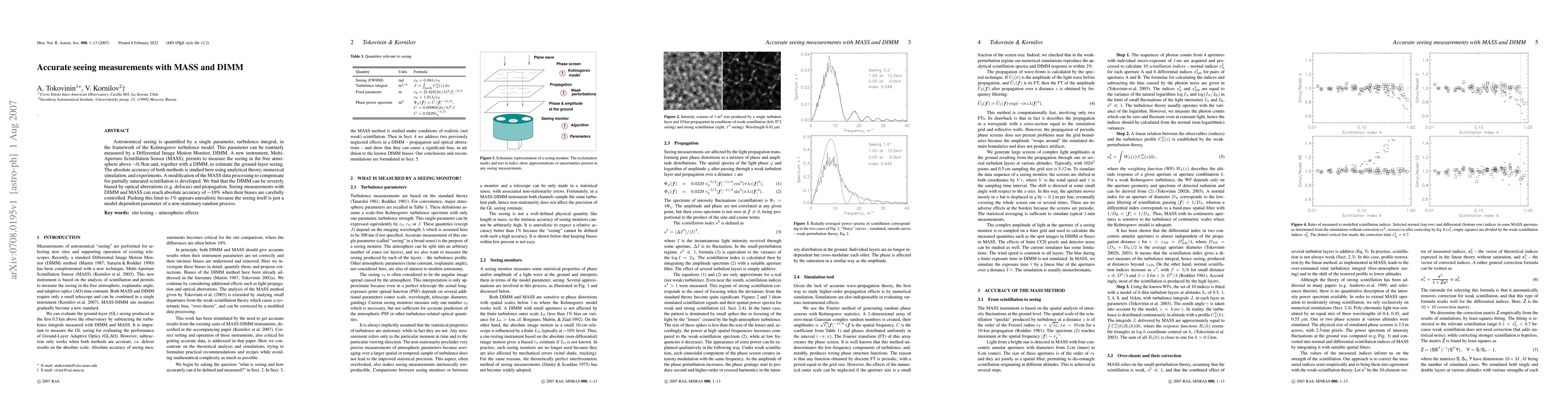 Astronomical seeing is quantified by a single parameter, turbulence integral, in the framework of the Kolmogorov turbulence model. This parameter can be routinely measured by a Differential Image Motion Monitor, DIMM. A new instrument, Multi-Aperture Scintillation Sensor (MASS), permits to measure the seeing in the free atmosphere above ~0.5km and, together with a DIMM, to estimate the ground-layer seeing. The absolute accuracy of both methods is studied here using analytical theory, numerical simulation, and experiments. A modification of the MASS data processing to compensate for partially saturated scintillation is developed. We find that the DIMM can be severely biased by optical aberrations (e.g. defocus) and propagation. Seeing measurements with DIMM and MASS can reach absolute accuracy of ~10% when their biases are carefully controlled. Pushing this limit to 1% appears unrealistic because the seeing itself is just a model-dependent parameter of a non-stationary random process.