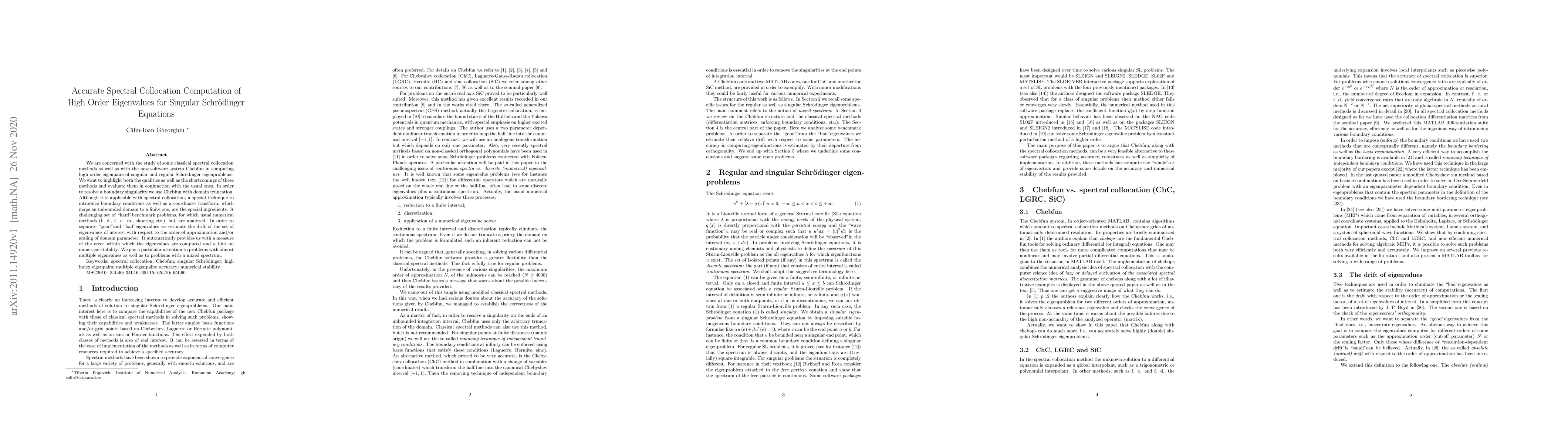 We are concerned with the study of some classical spectral collocation methods as well as with the new software system Chebfun in computing high order eigenpairs of singular and regular Schrodinger eigenproblems. We want to highlight both the qualities as well as the shortcomings of these methods and evaluate them in conjunction with the usual ones. In order to resolve a boundary singularity we use Chebfun with domain truncation. Although it is applicable with spectral collocation, a special technique to introduce boundary conditions as well as a coordinate transform, which maps an unbounded domain to a finite one, are the special ingredients. A challenging set of \hard"benchmark problems, for which usual numerical methods (f. d., f. e. m., shooting etc.) fail, are analyzed. In order to separate \good"and \bad"eigenvalues we estimate the drift of the set of eigenvalues of interest with respect to the order of approximation and/or scaling of domain parameter. It automatically provides us with a measure of the error within which the eigenvalues are computed and a hint on numerical stability. We pay a particular attention to problems with almost multiple eigenvalues as well as to problems with a mixed spectrum.