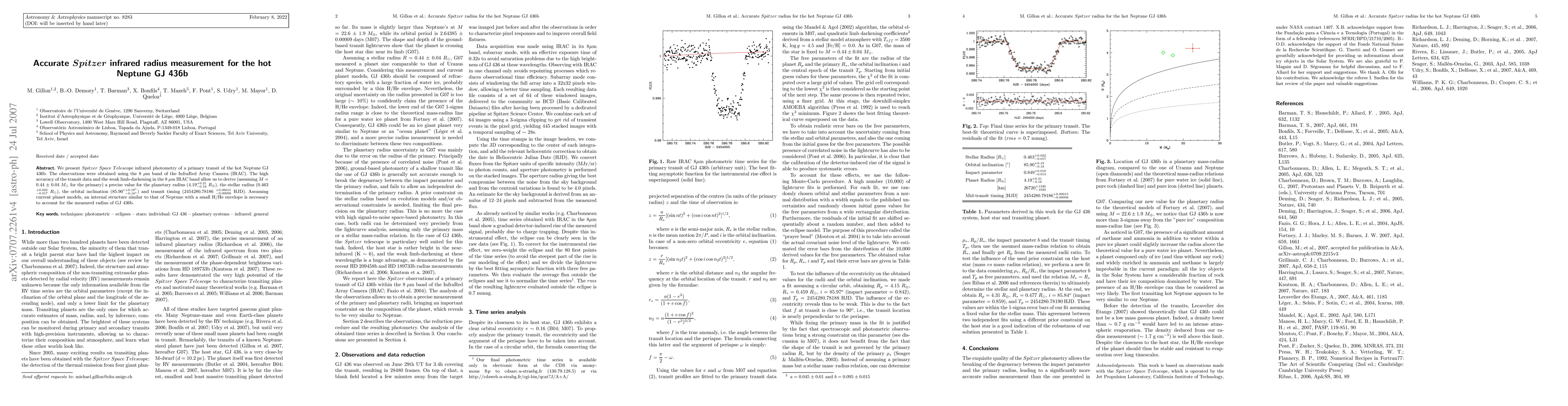 This study uses Spitzer Space Telescope infrared data to measure the radius of the hot Neptune GJ 436b with high precision, finding it to be 4.19 ± 0.21 Earth radii, suggesting an internal structure similar to Neptune with a small hydrogen/helium envelope. The research also determines the stellar radius and transit parameters with significant accuracy.