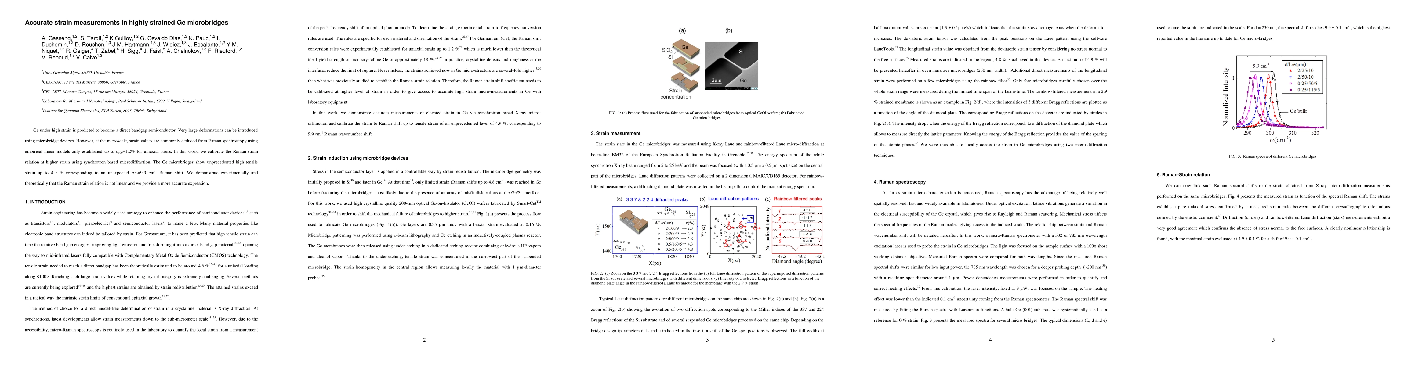 This study calibrates Raman spectroscopy for accurate strain measurements in highly strained Ge microbridges, revealing that the strain-Raman relation is non-linear. Using synchrotron-based microdiffraction, the researchers achieve unprecedented tensile strains up to 4.9%, providing a new, more accurate expression for the Raman-strain relationship.