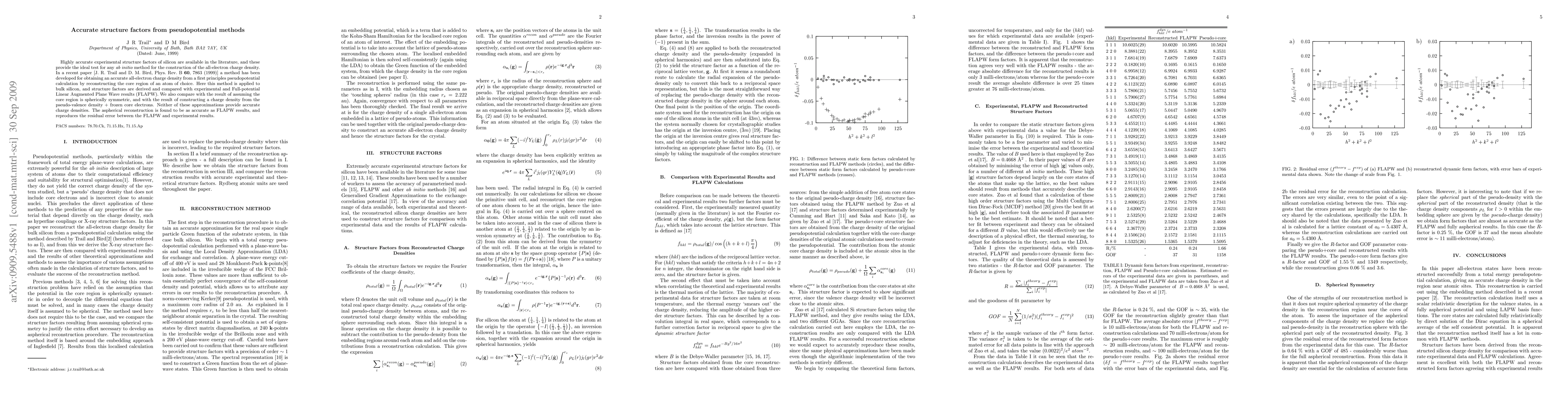 Highly accurate experimental structure factors of silicon are available in the literature, and these provide the ideal test for any \emph{ab initio} method for the construction of the all-electron charge density. In a recent paper [J. R. Trail and D. M. Bird, Phys. Rev. B {\bf 60}, 7863 (1999)] a method has been developed for obtaining an accurate all-electron charge density from a first principles pseudopotential calculation by reconstructing the core region of an atom of choice. Here this method is applied to bulk silicon, and structure factors are derived and compared with experimental and Full-potential Linear Augmented Plane Wave results (FLAPW). We also compare with the result of assuming the core region is spherically symmetric, and with the result of constructing a charge density from the pseudo-valence density + frozen core electrons. Neither of these approximations provide accurate charge densities. The aspherical reconstruction is found to be as accurate as FLAPW results, and reproduces the residual error between the FLAPW and experimental results.