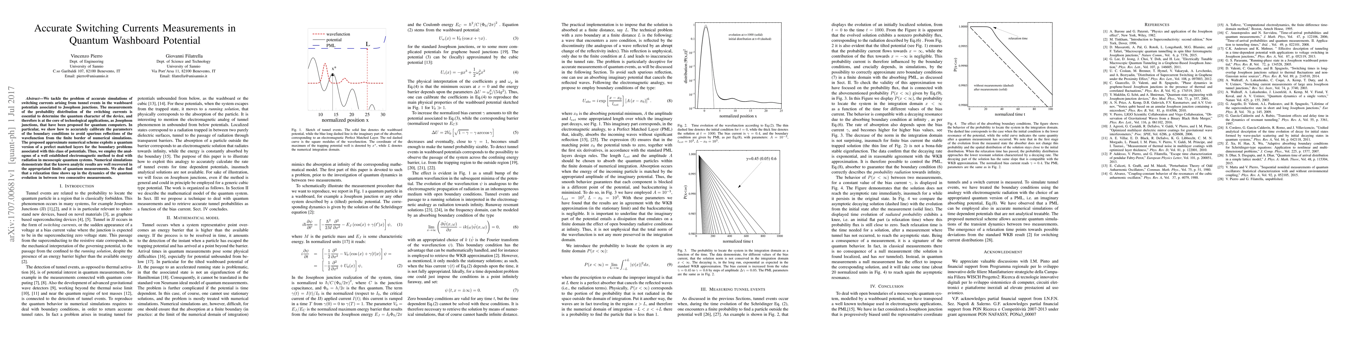 We tackle the problem of accurate simulations of switching currents arising from tunnel events in the washboard potentials associated to Josephson junctions. The measurements of the probability distribution of the switching currents is essential to determine the quantum character of the device, and therefore is at the core of technological applications, as Josephson junctions, that have been proposed for quantum computers. In particular, we show how to accurately calibrate the parameters of the boundary conditions to avoid spurious reflections of the wavefunction from the finite border of numerical simulations. The proposed approximate numerical scheme exploits a quantum version of a prefect matched layers for the boundary problems associated with this class of potentials. Thus, we employ the analogous of a well established electromagnetic method to deal with radiation in mesoscopic quantum systems. Numerical simulations demonstrate that the known analytic results are well recovered in the appropriated limits of quantum measurements. We also find that a relaxation time shows up in the dynamics of the quantum evolution in between two consecutive measurements.