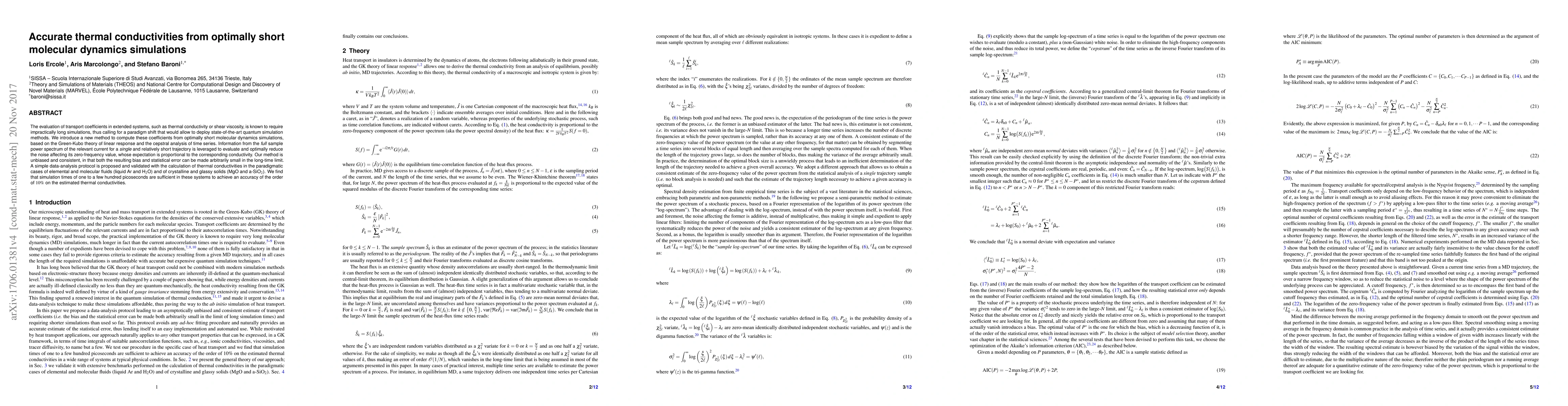 This paper presents a novel method for calculating thermal conductivities from short molecular dynamics simulations, leveraging cepstral analysis and the Green-Kubo theory to reduce noise and achieve high accuracy. The method is validated on various fluids and solids, demonstrating that only picosecond-scale simulations are needed for 10% accuracy.