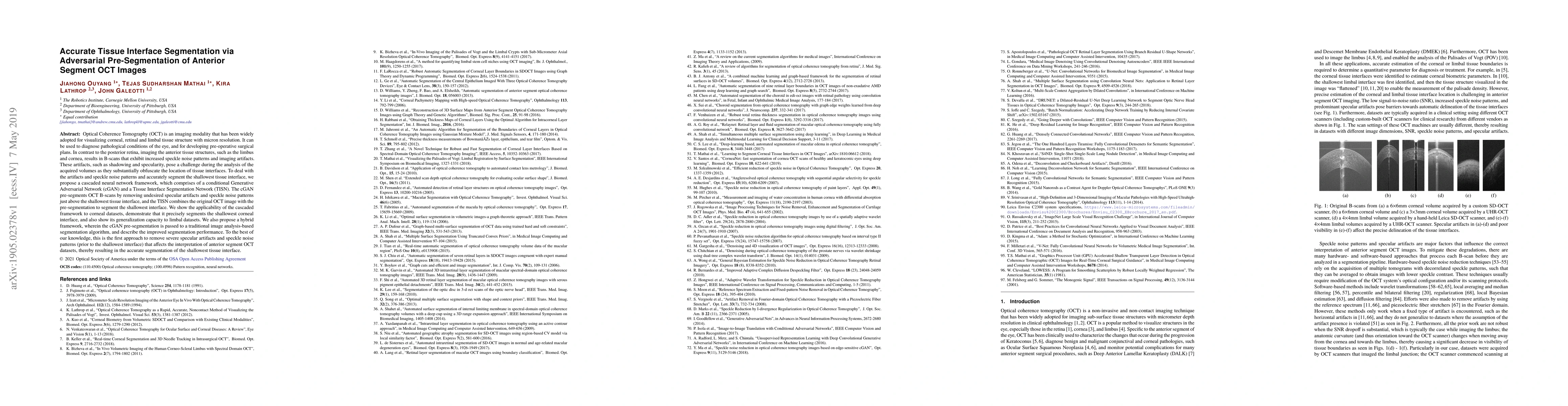 This paper proposes a cascaded neural network framework using a conditional Generative Adversarial Network (cGAN) and a Tissue Interface Segmentation Network (TISN) to accurately segment the shallowest tissue interfaces in anterior segment OCT images, addressing challenges posed by specular artifacts and speckle noise. The cGAN pre-segments images to remove noise, and the TISN segments the cleaned data, demonstrating precise corneal interface segmentation and generalization to limbal datasets.