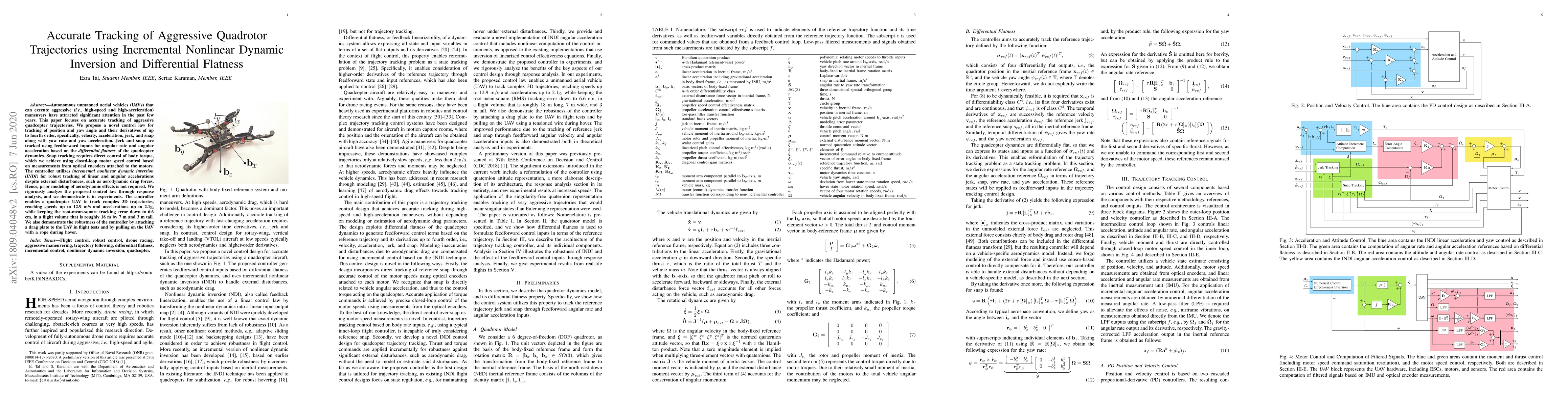 This paper proposes a novel control law for an autonomous quadcopter to accurately track aggressive high-speed and high-acceleration 3D trajectories using incremental nonlinear dynamic inversion and differential flatness. The control law achieves robust tracking of position, velocity, acceleration, jerk, snap, and yaw dynamics, demonstrating performance in complex maneuvers with minimal error.