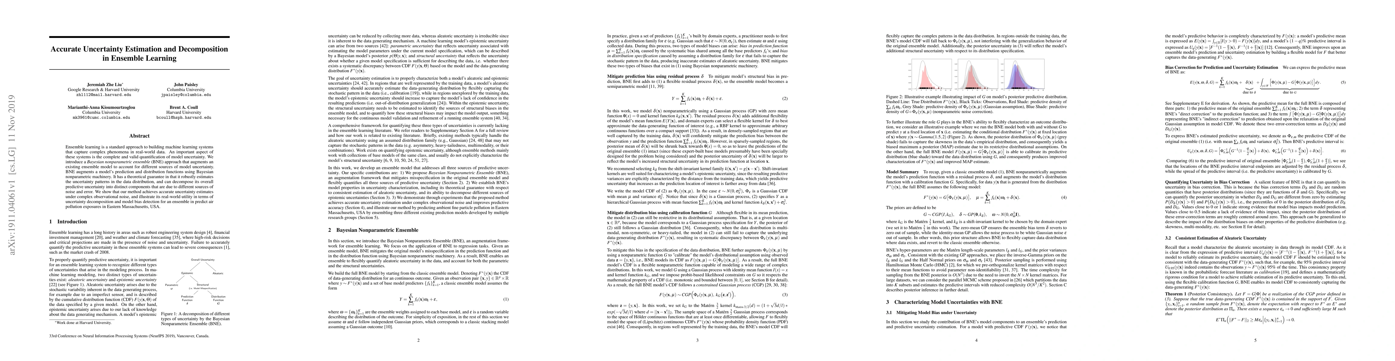 Ensemble learning is a standard approach to building machine learning systems that capture complex phenomena in real-world data. An important aspect of these systems is the complete and valid quantification of model uncertainty. We introduce a Bayesian nonparametric ensemble (BNE) approach that augments an existing ensemble model to account for different sources of model uncertainty. BNE augments a model's prediction and distribution functions using Bayesian nonparametric machinery. It has a theoretical guarantee in that it robustly estimates the uncertainty patterns in the data distribution, and can decompose its overall predictive uncertainty into distinct components that are due to different sources of noise and error. We show that our method achieves accurate uncertainty estimates under complex observational noise, and illustrate its real-world utility in terms of uncertainty decomposition and model bias detection for an ensemble in predict air pollution exposures in Eastern Massachusetts, USA.