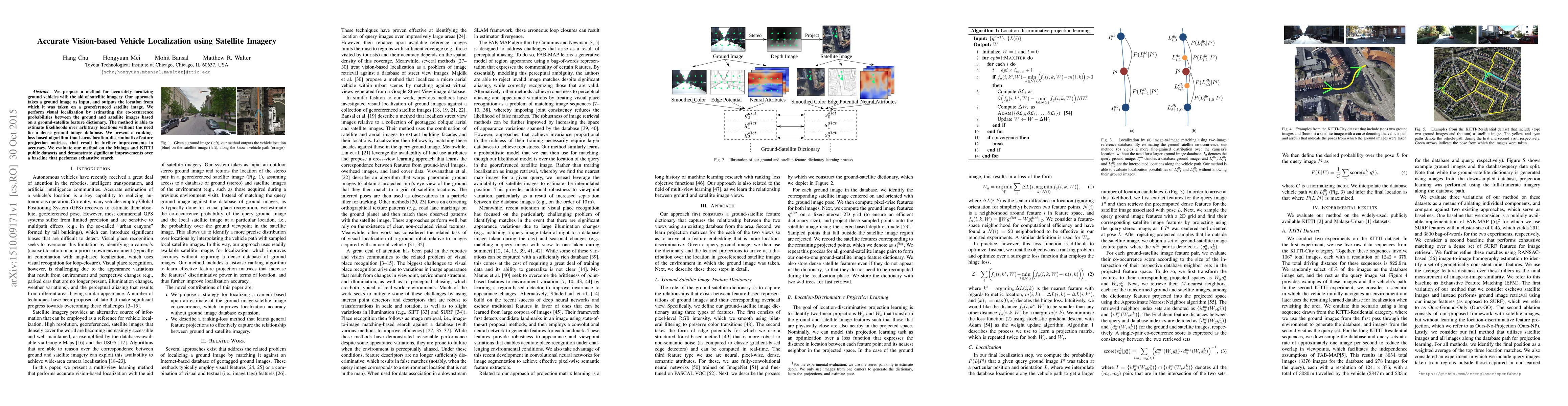 This paper proposes a method to accurately localize ground vehicles using satellite imagery by estimating co-occurrence probabilities between ground and satellite images, achieving significant improvements over baseline methods.