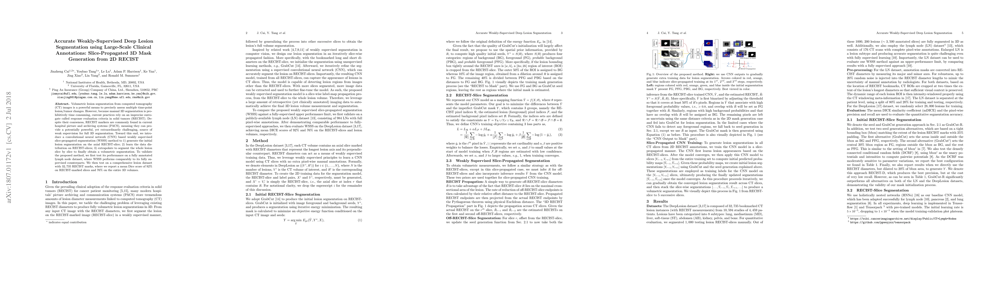 This paper proposes a CNN-based weakly supervised method for volumetric lesion segmentation from CT images using RECIST markers as weak supervision. The method generates initial 2D segmentations on RECIST slices and extrapolates these to obtain full 3D segmentations, achieving a mean Dice score of 92% on RECIST slices and 76% on 3D volumes.