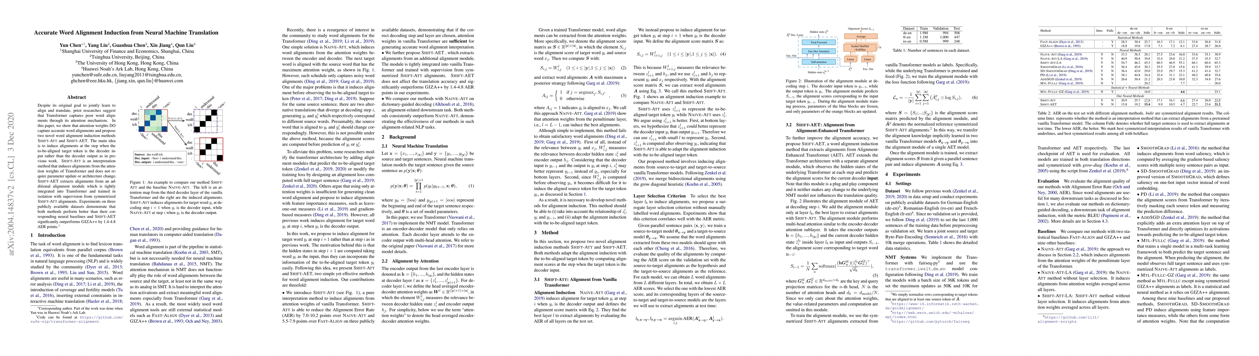 The paper proposes two methods, Shift-Att and Shift-AET, for word alignment induction from neural machine translation. Shift-Att is an interpretation method that extracts alignments from Transformer attention weights without parameter updates or architectural changes. Shift-AET extends Transformer with an additional alignment module trained with supervision from symmetrized Shift-Att alignments.