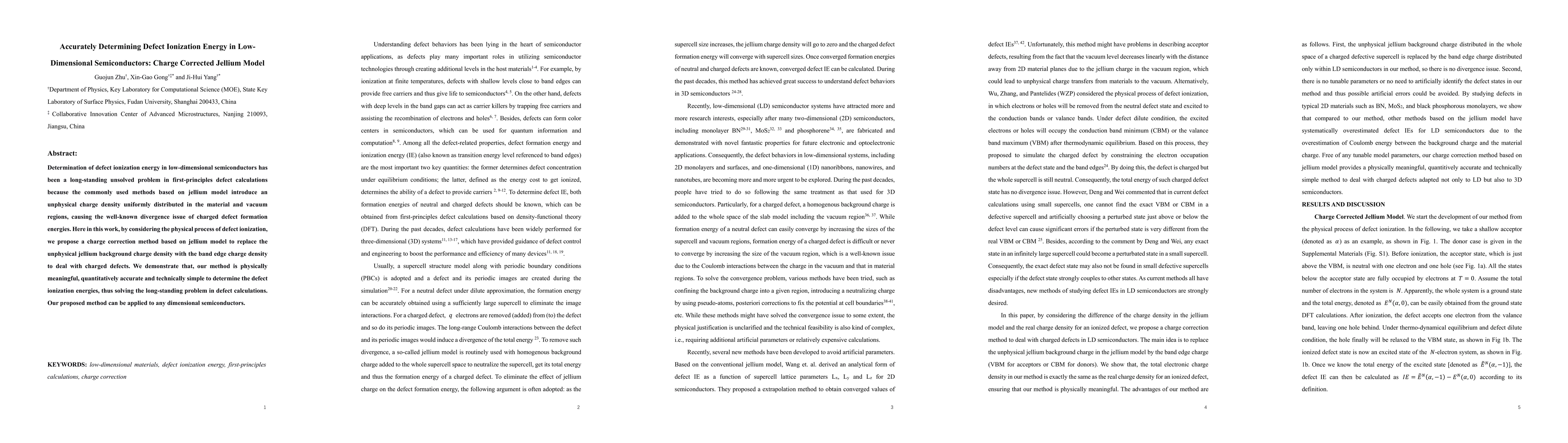 This paper proposes a charge corrected jellium model to accurately determine defect ionization energy in low-dimensional semiconductors, addressing the divergence issue caused by the unphysical charge density in traditional jellium models. The method replaces the unphysical background charge density with band edge charge density, demonstrating physical accuracy and technical simplicity.