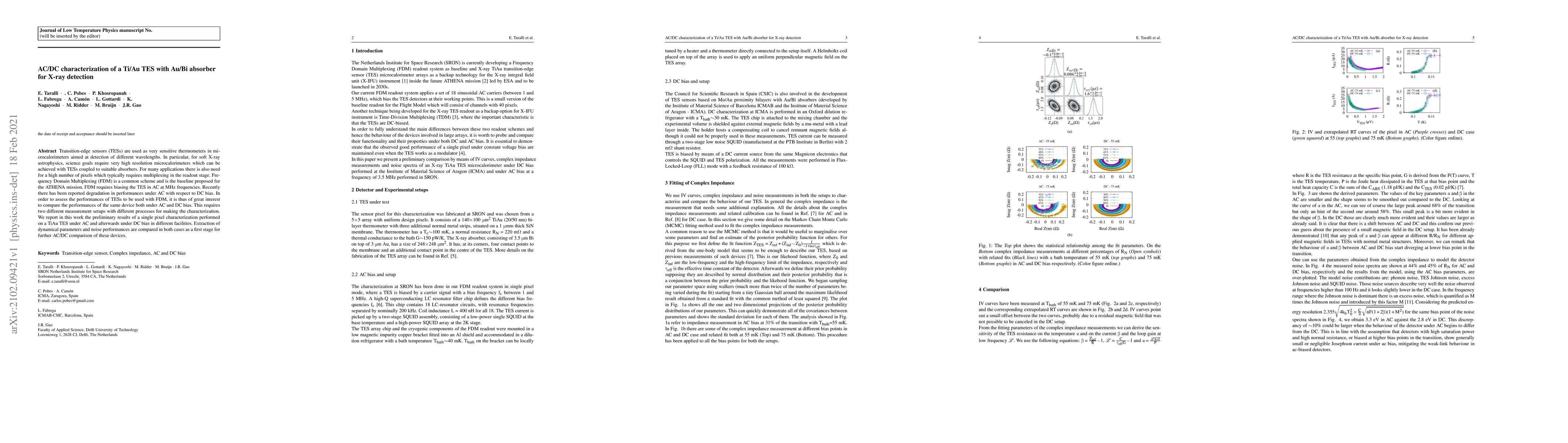 Transition-edge sensors (TESs) are used as very sensitive thermometers in microcalorimeters aimed at detection of different wavelengths. In particular, for soft X-ray astrophysics, science goals require very high resolution microcalorimeters which can be achieved with TESs coupled to suitable absorbers. For many applications there is also need for a high number of pixels which typically requires multiplexing in the readout stage. Frequency Domain Multiplexing (FDM) is a common scheme and is the baseline proposed for the ATHENA mission. FDM requires biasing the TES in AC at MHz frequencies. Recently there has been reported degradation in performances under AC with respect to DC bias. In order to assess the performances of TESs to be used with FDM, it is thus of great interest to compare the performances of the same device both under AC and DC bias. This requires two different measurement setups with different processes for making the characterization. We report in this work the preliminary results of a single pixel characterization performed on a TiAu TES under AC and afterwards under DC bias in different facilities. Extraction of dynamical parameters and noise performances are compared in both cases as a first stage for further AC/DC comparison of these devices.