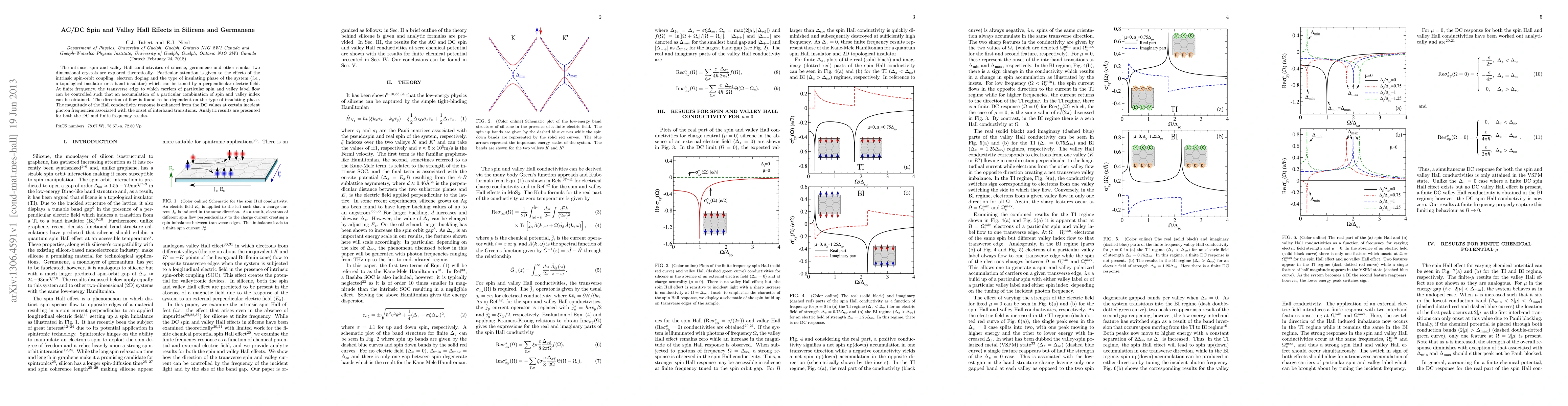 The intrinsic spin and valley Hall conductivities of silicene, germanene and other similar two dimensional crystals are explored theoretically. Particular attention is given to the effects of the intrinsic spin-orbit coupling, electron doping and the type of insulating phase of the system (i.e., a topological insulator or a band insulator) which can be tuned by a perpendicular electric field. At finite frequency, the transverse edge to which carriers of particular spin and valley label flow can be controlled such that an accumulation of a particular combination of spin and valley index can be obtained. The direction of flow is found to be dependent on the type of insulating phase. The magnitude of the Hall conductivity response is enhanced from the DC values at certain incident photon frequencies associated with the onset of interband transitions. Analytic results are presented for both the DC and finite frequency results.