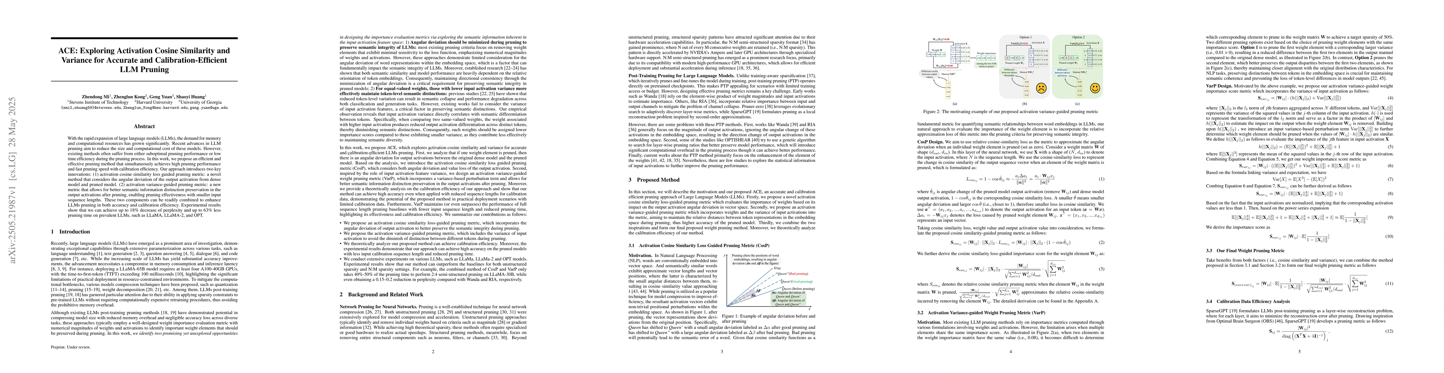 The paper proposes an efficient and effective pruning method for large language models (LLMs) by introducing an activation cosine similarity loss-guided pruning metric and an activation variance-guided pruning metric, enhancing both accuracy and pruning efficiency.