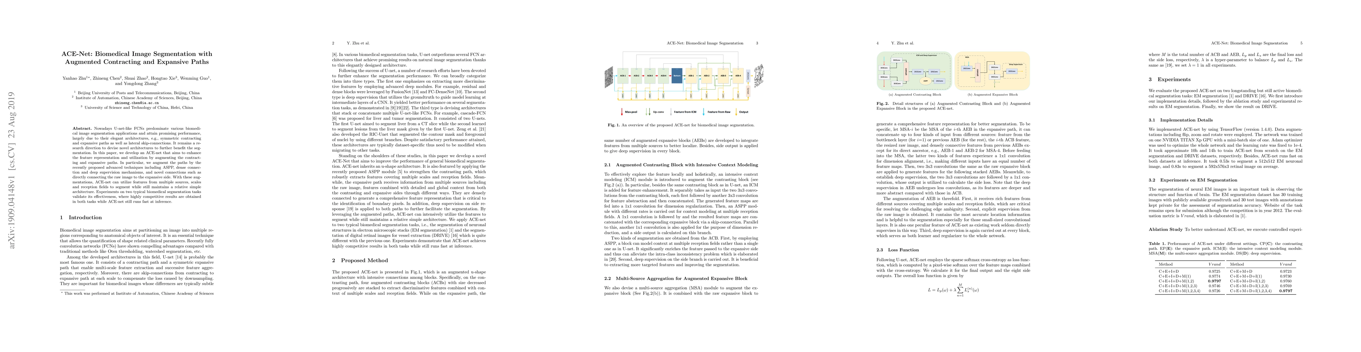 Nowadays U-net-like FCNs predominate various biomedical image segmentation applications and attain promising performance, largely due to their elegant architectures, e.g., symmetric contracting and expansive paths as well as lateral skip-connections. It remains a research direction to devise novel architectures to further benefit the segmentation. In this paper, we develop an ACE-net that aims to enhance the feature representation and utilization by augmenting the contracting and expansive paths. In particular, we augment the paths by the recently proposed advanced techniques including ASPP, dense connection and deep supervision mechanisms, and novel connections such as directly connecting the raw image to the expansive side. With these augmentations, ACE-net can utilize features from multiple sources, scales and reception fields to segment while still maintains a relative simple architecture. Experiments on two typical biomedical segmentation tasks validate its effectiveness, where highly competitive results are obtained in both tasks while ACE-net still runs fast at inference.