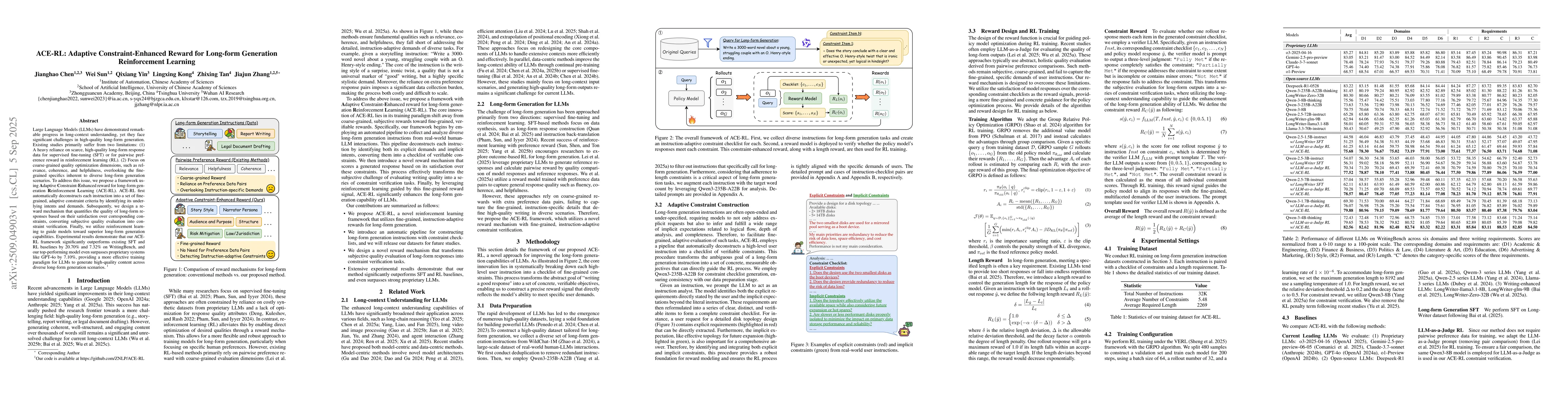 Large Language Models (LLMs) have demonstrated remarkable progress in long-context understanding, yet they face significant challenges in high-quality long-form generation. Existing studies primarily suffer from two limitations: (1) A heavy reliance on scarce, high-quality long-form response data for supervised fine-tuning (SFT) or for pairwise preference reward in reinforcement learning (RL). (2) Focus on coarse-grained quality optimization dimensions, such as relevance, coherence, and helpfulness, overlooking the fine-grained specifics inherent to diverse long-form generation scenarios. To address this issue, we propose a framework using Adaptive Constraint-Enhanced reward for long-form generation Reinforcement Learning (ACE-RL). ACE-RL first automatically deconstructs each instruction into a set of fine-grained, adaptive constraint criteria by identifying its underlying intents and demands. Subsequently, we design a reward mechanism that quantifies the quality of long-form responses based on their satisfaction over corresponding constraints, converting subjective quality evaluation into constraint verification. Finally, we utilize reinforcement learning to guide models toward superior long-form generation capabilities. Experimental results demonstrate that our ACE-RL framework significantly outperforms existing SFT and RL baselines by 20.70% and 7.32% on WritingBench, and our top-performing model even surpasses proprietary systems like GPT-4o by 7.10%, providing a more effective training paradigm for LLMs to generate high-quality content across diverse long-form generation scenarios.