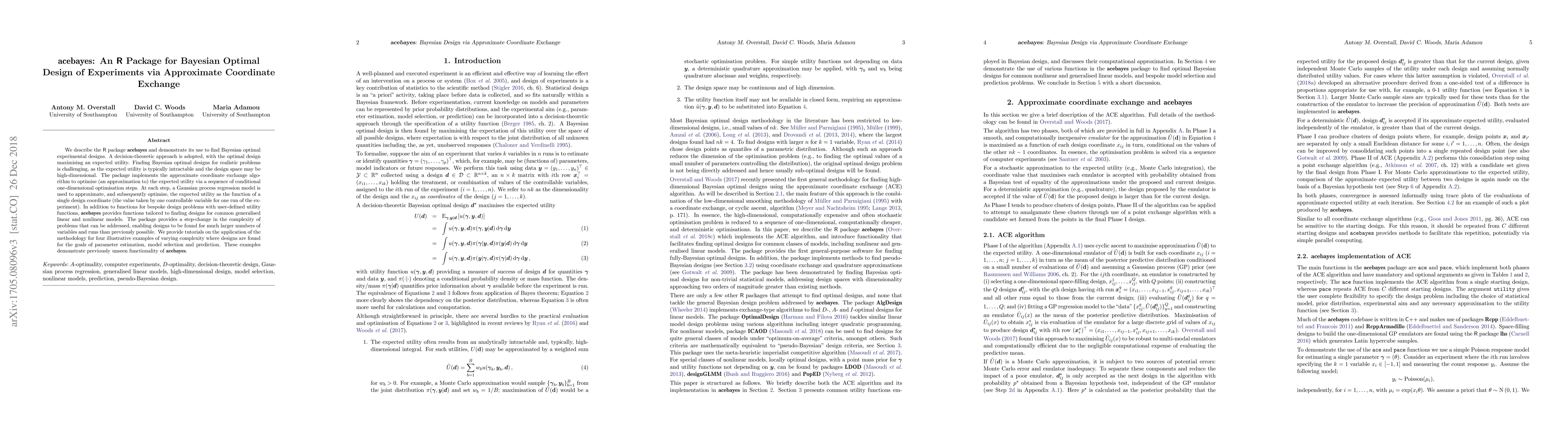 The acebayes R package facilitates Bayesian optimal experimental design through an approximate coordinate exchange algorithm, optimizing an expected utility function using Gaussian process regression. It enables the handling of complex, high-dimensional problems, providing solutions for generalized linear and nonlinear models.