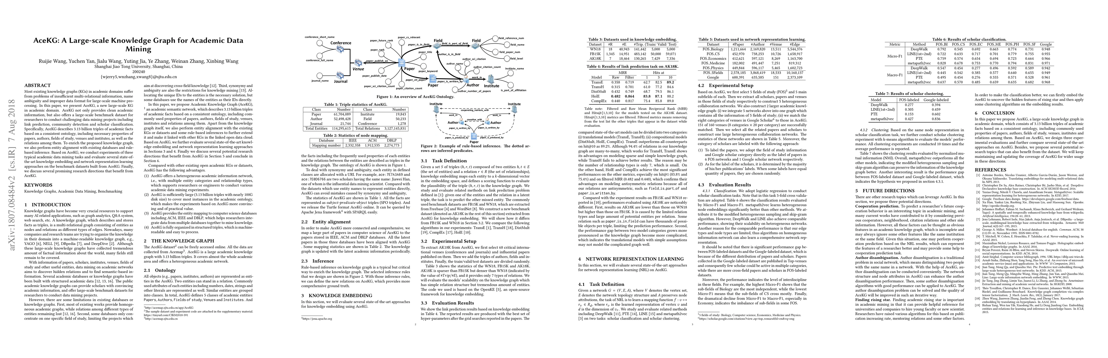 AceKG is a large-scale, clean academic knowledge graph containing 3.13 billion triples, addressing issues like name ambiguity and providing a benchmark for data mining tasks. It supports link prediction, community detection, and scholar classification through enriched datasets and state-of-the-art evaluation methods.