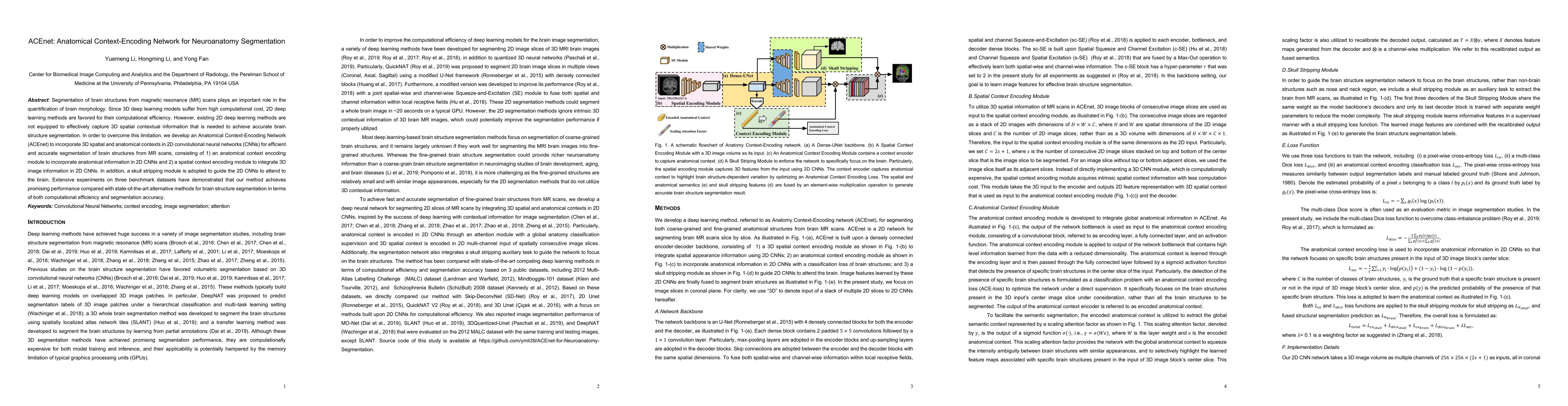 The ACEnet incorporates anatomical and spatial context encoding modules into 2D CNNs to enhance brain structure segmentation from MR scans, improving both accuracy and efficiency over existing 2D methods. Experiments on benchmark datasets show ACEnet outperforms state-of-the-art alternatives.