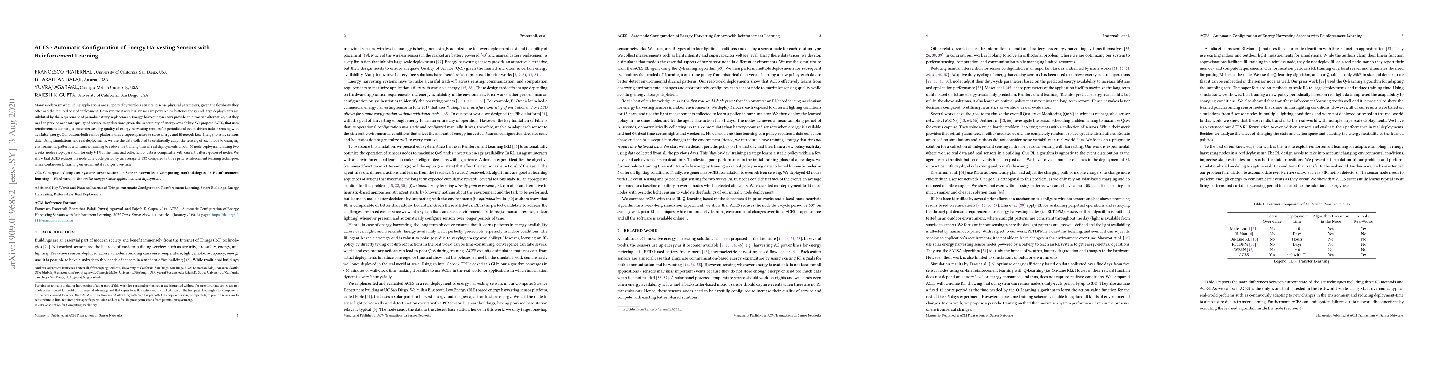The paper proposes ACES, a system using reinforcement learning to optimize energy harvesting sensors for IoT applications, enabling them to adapt to varying energy availability from ambient light. Through simulations and real deployments, the system demonstrates effective adaptation to lighting conditions and high event detection rates, achieving a minimal dead time of 0.1%.