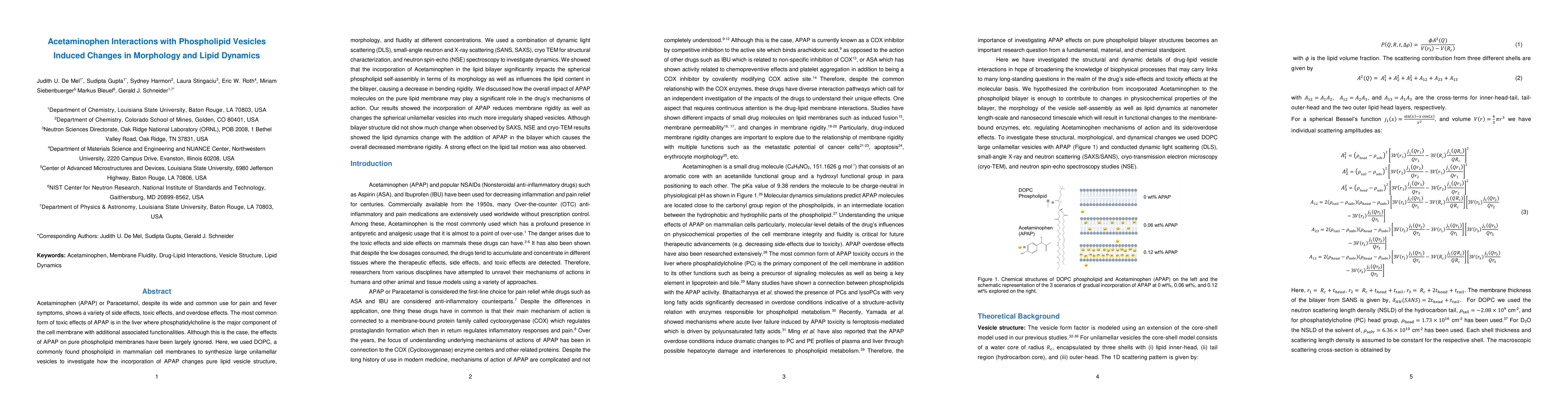 Acetaminophen (APAP) or Paracetamol, despite its wide and common use for pain and fever symptoms, shows a variety of side effects, toxic effects, and overdose effects. The most common form of toxic effects of APAP is in the liver where phosphatidylcholine is the major component of the cell membrane with additional associated functionalities. Although this is the case, the effects of APAP on pure phospholipid membranes have been largely ignored. Here, we used DOPC, a commonly found phospholipid in mammalian cell membranes to synthesize large unilamellar vesicles to investigate how the incorporation of APAP changes pure lipid vesicle structure, morphology, and fluidity at different concentrations. We used a combination of dynamic light scattering (DLS), small-angle neutron and X-ray scattering (SANS, SAXS), cryo TEM for structural characterization, and neutron spin-echo (NSE) spectroscopy to investigate dynamics. We showed that the incorporation of Acetaminophen in the lipid bilayer significantly impacts the spherical phospholipid self-assembly in terms of its morphology as well as influences the lipid content in the bilayer, causing a decrease in bending rigidity. We discussed how the overall impact of APAP molecules on the pure lipid membrane may play a significant role in the drug's mechanisms of action. Our results showed the incorporation of APAP reduces membrane rigidity as well as changes the spherical unilamellar vesicles into much more irregularly shaped vesicles. Although bilayer structure did not show much change when observed by SAXS, NSE and cryo-TEM results showed the lipid dynamics change with the addition of APAP in the bilayer which causes the overall decreased membrane rigidity. A strong effect on the lipid tail motion was also observed. rigidity. A strong effect on the lipid tail motion was also observed.
