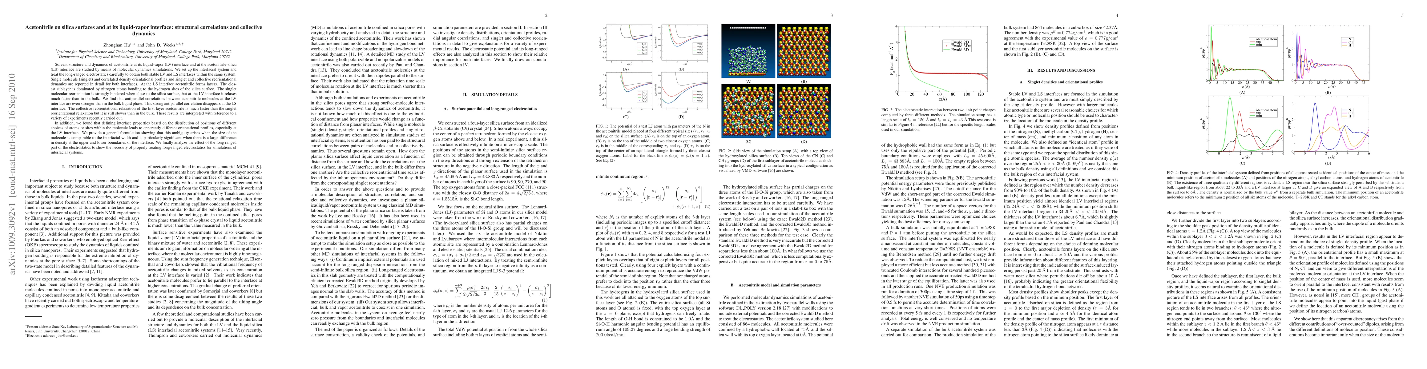 Solvent structure and dynamics of acetonitrile at its liquid-vapor (LV) interface and at the acetonitrile-silica (LS) interface are studied by means of molecular dynamics simulations. We set up the interfacial system and treat the long-ranged electrostatics carefully to obtain both stable LV and LS interfaces within the same system. Single molecule (singlet) and correlated density orientational profiles and singlet and collective reorientational dynamics are reported for both interfaces. At the LS interface acetonitrile forms layers. The closest sublayer is dominated by nitrogen atoms bonding to the hydrogen sites of the silica surface. The singlet molecular reorientation is strongly hindered when close to the silica surface, but at the LV interface it relaxes much faster than in the bulk. Antiparallel correlations between acetonitrile molecules at the LV interface are even stronger than in the bulk liquid phase. This strong antiparallel correlation disappears at the LS interface. The collective reorientational relaxation of the first layer acetonitrile is much faster than the singlet reorientational relaxation but it is still slower than in the bulk. These results are interpreted with reference to a variety of recent experiments. We found that defining interface properties based on the distribution of positions of different choices of atoms or sites within the molecule leads to apparently different orientational profiles, especially at the LV interface. We provide a general formulation showing that this ambiguity arises when the size of the molecule is comparable to the interfacial width and is particularly significant when there is a large difference in density at the upper and lower boundaries of the interface. We finally analyze the effect of electrostatics to show the necessity of properly treating long-ranged electrostatics for simulations of interfacial systems.