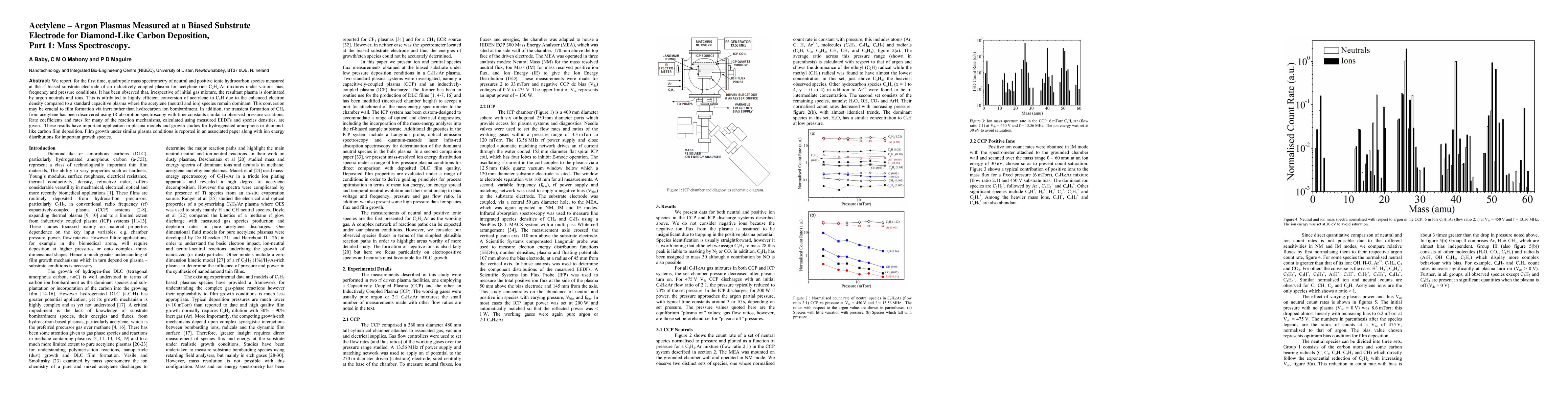 This study employs quadrupole mass spectrometry to analyze neutral and ionic hydrocarbon species in acetylene-argon plasmas under various conditions, revealing that argon dominates the plasma due to efficient conversion of acetylene to C2H. This conversion is crucial for diamond-like carbon film deposition via inert ion bombardment, with transient formation of CH4 also observed.