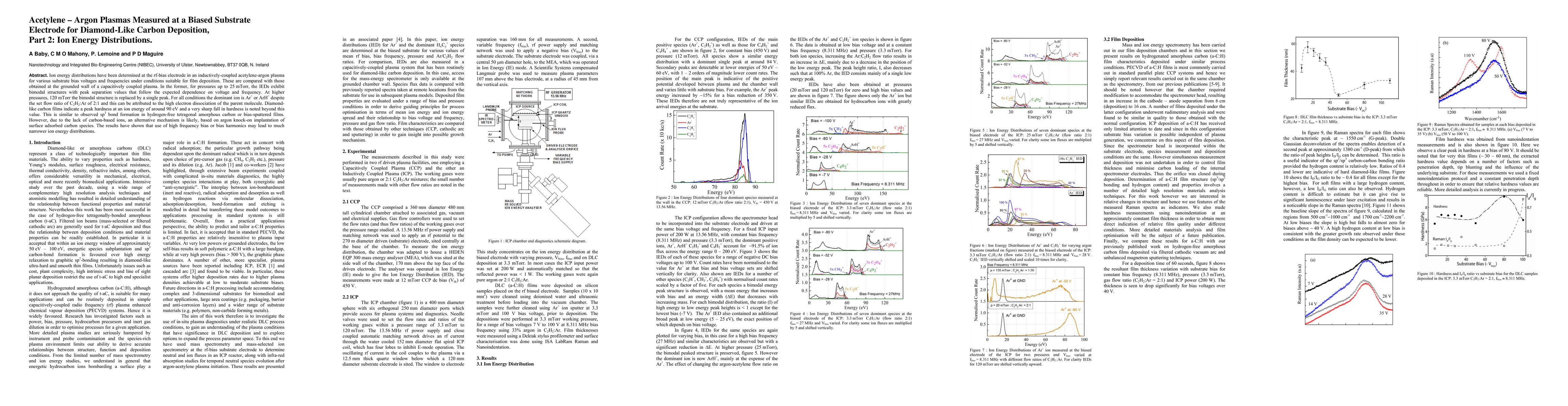 Ion energy distributions have been determined at the rf-bias electrode in an inductively-coupled acetylene-argon plasma for various substrate bias voltages and frequencies under conditions suitable for film deposition. These are compared with those obtained at the grounded wall of a capacitively coupled plasma. In the former, for pressures up to 25 mTorr, the IEDs exhibit bimodal structures with peak separation values that follow the expected dependence on voltage and frequency. At higher pressures, 120 mTorr, the bimodal structure is replaced by a single peak. For all conditions, the dominant ion is Ar+ or ArH+ despite a set C2H2:Ar flow ratio of 2:1, and this can be attributed to the high electron dissociation of the parent molecule. Diamond-like carbon films indicate a peak hardness at an ion energy of around 90 eV and a very sharp fall in hardness is noted beyond this value. This is similar to the observed bombardment energy relationship for sp3 bond formation in hydrogen-free tetragonal amorphous carbon or bias-sputtered films. However, due to the lack of carbon-based ions, an alternative film growth mechanism must be considered, possibly based on argon knock-on implantation of surface adsorbed carbon species. The results have shown that the use of high frequency bias or bias harmonics may lead to much narrower ion energy distributions.