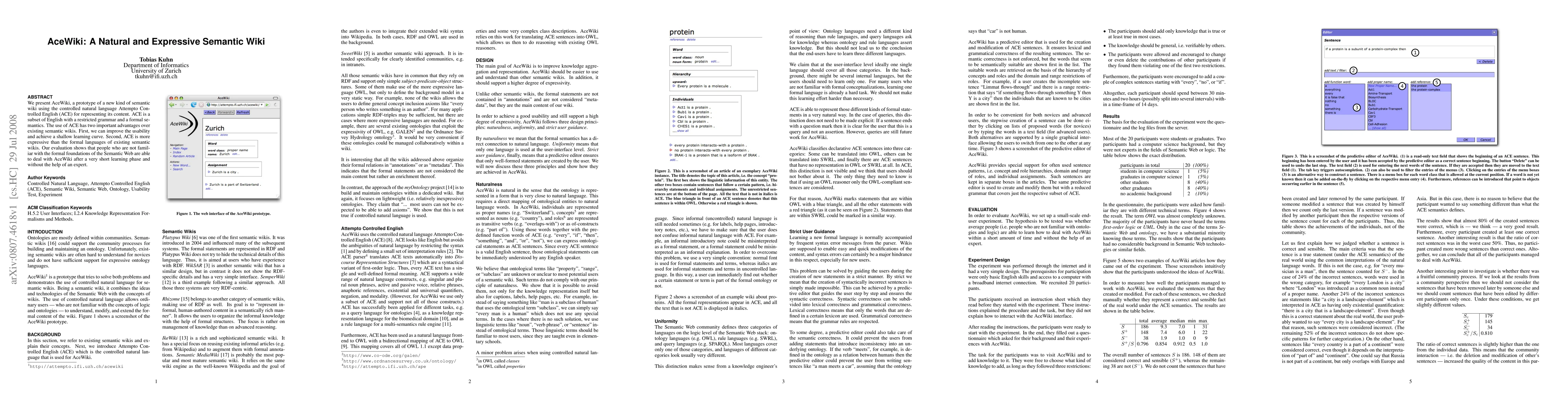 AceWiki employs Attempto Controlled English (ACE) to create a natural and expressive semantic wiki, offering improved usability and a shallow learning curve. Evaluations demonstrate that non-experts can easily navigate AceWiki after minimal instruction.