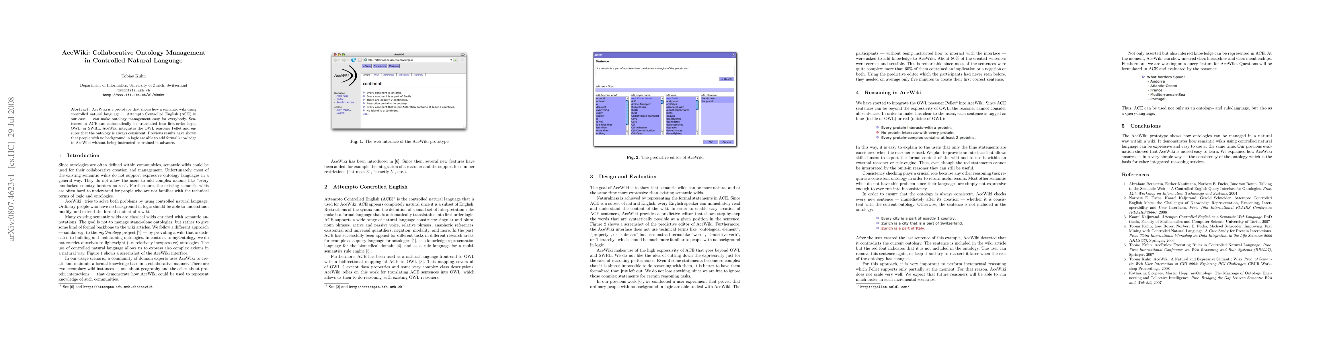 AceWiki demonstrates a semantic wiki using Attempto Controlled English (ACE) that simplifies ontology management for non-experts. It automatically translates ACE sentences to first-order logic, OWL, and SWRL, ensuring ontology consistency with the Pellet reasoner.